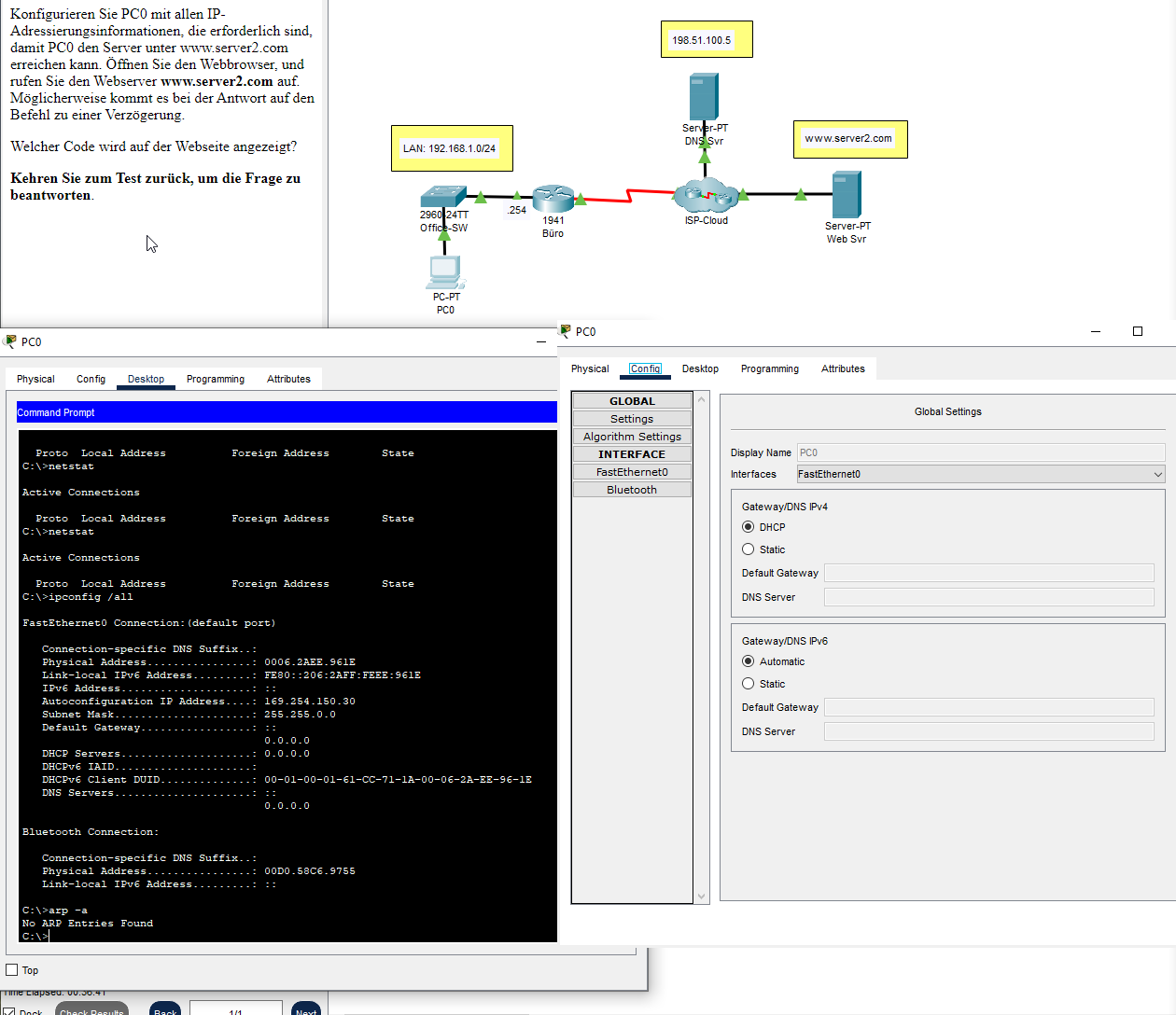 PC0 soll konfiguriert werden und dieser soll durch den Webbrowser www.server2.com erreichen.