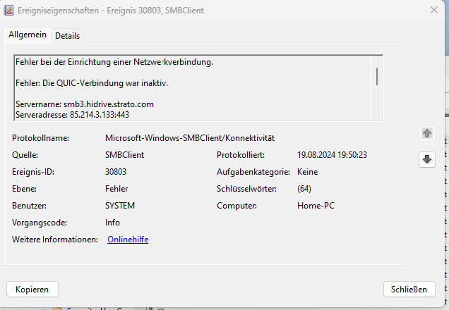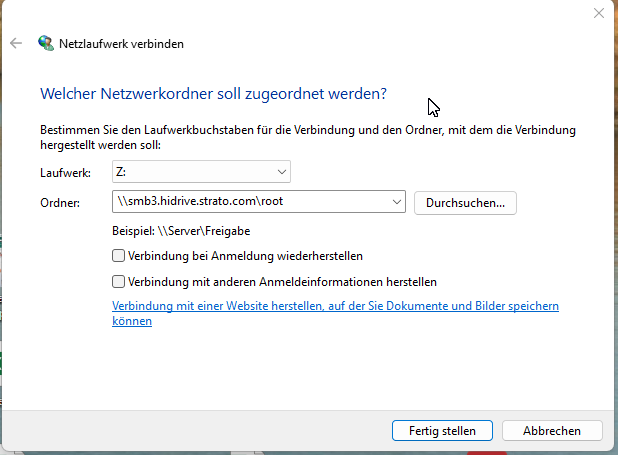 Deshalb habe ich „Netzlaufwerk verbinden“ gewählt. Im erscheinenden Fenster habe ich das von Strato empfohlenen SMB-Protokoll eingegeben. Einen Screenshot füge ich bei.