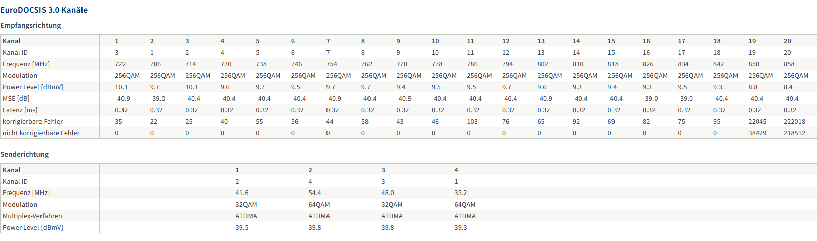 Ich habe meine FRITZ!Box gestern in der Neujahrsnacht mal neugestartet. Innerhalb eines Tages weichen vor allem wieder die Werte der Kanäle 19 und 20 extrem ab. Deine Werte hatte ich zeitweise auch.