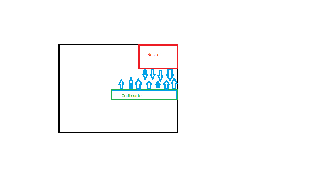 Das Netzteil sitzt direkt/flach an der Gehäuseoberseite und bläst mit einem Ventilator (140mm) die Luft, die sie davor von draußen angesaugt und im Netzteilinneren aufgewärmt hat, direkt auf den Luftstrom, der von der Grafikkarte aus kommt.