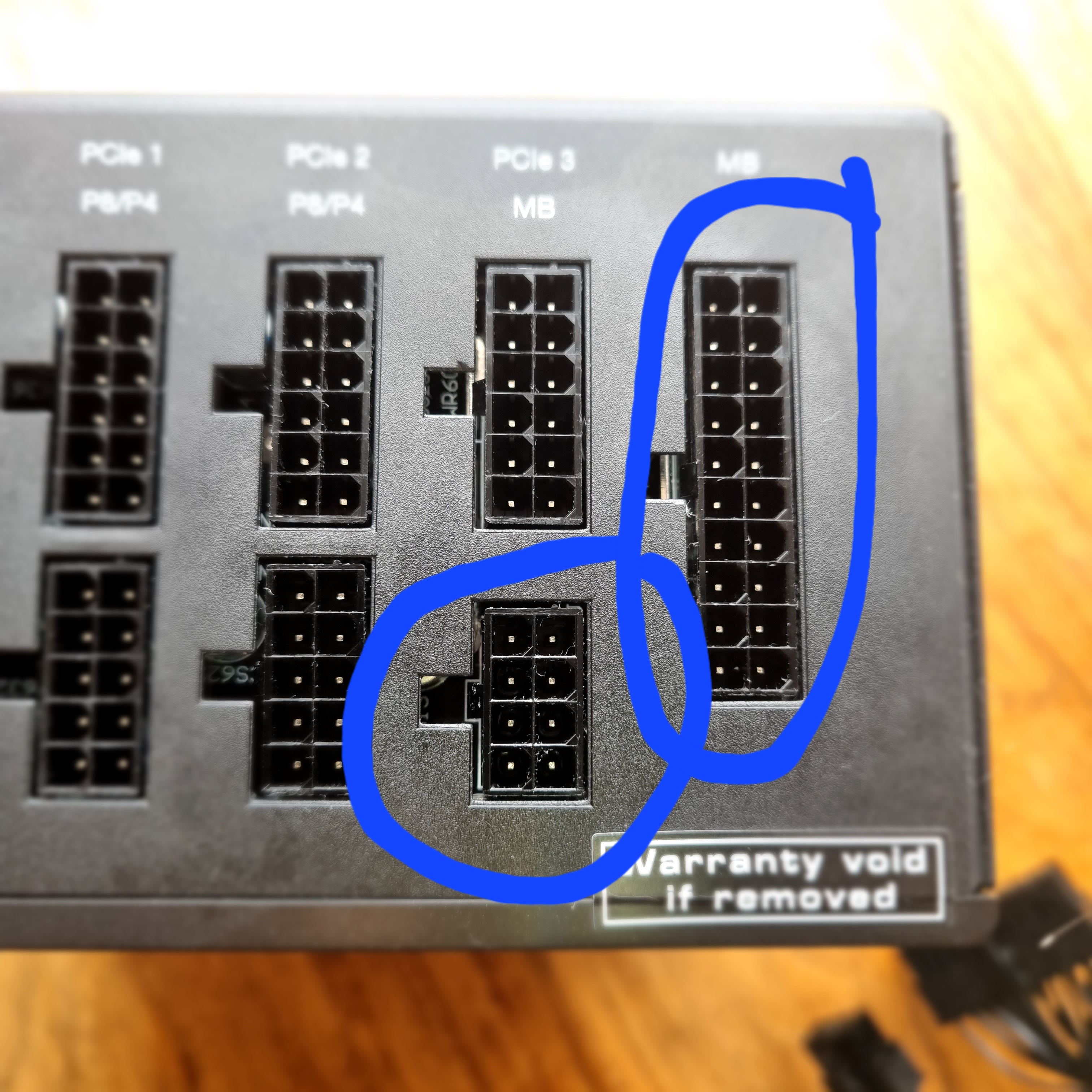 Für die Fehlersuche habe ich dann erstmal alle Modularstecker vom Netzteil getrennt, um sie anschließend eine nach dem anderen wieder einzustecken und jeweils dazwischen zu versuchen den Rechner zu starten.