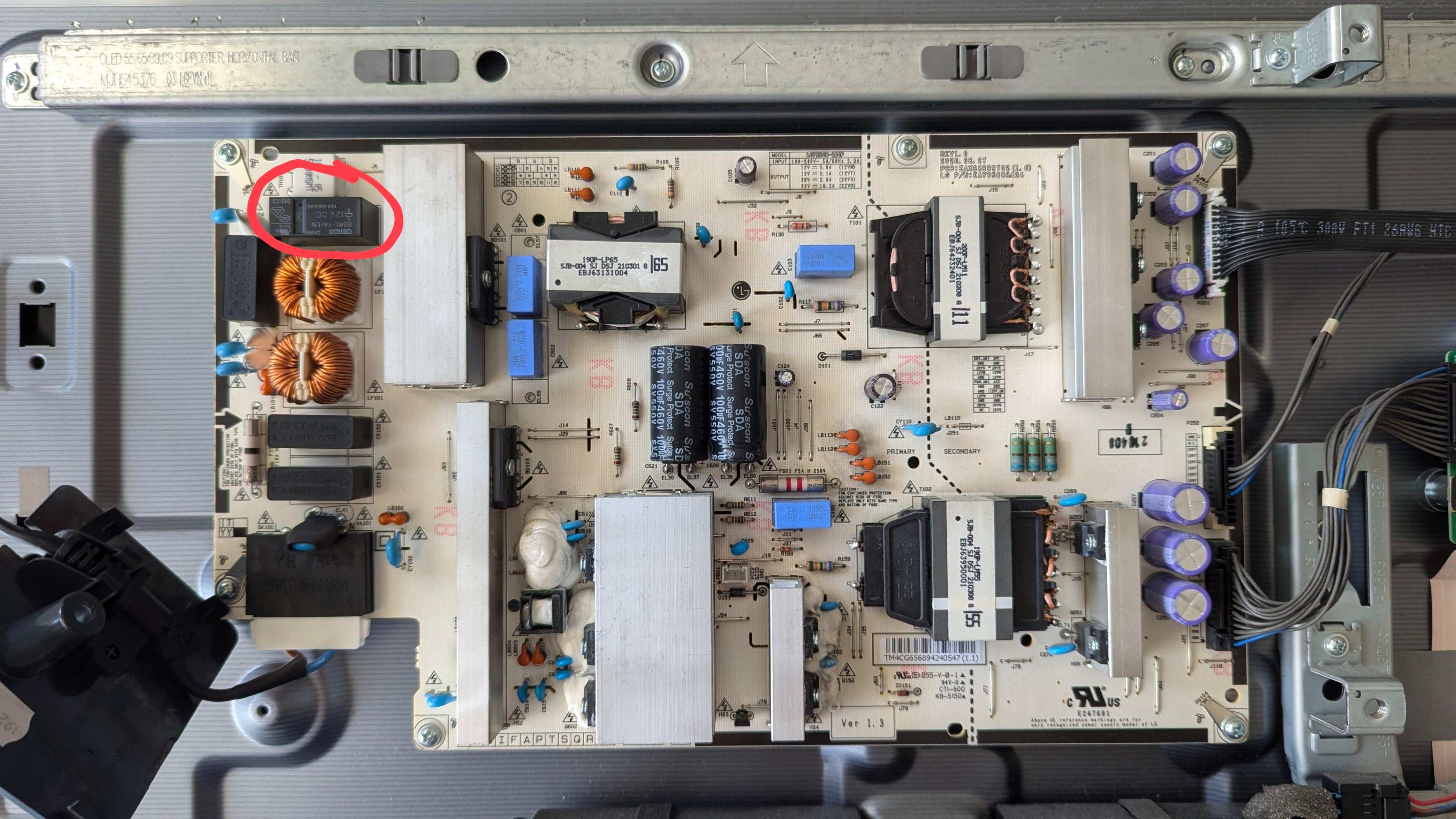 Folgendes ist nun zu beobachten. Wird der Fernseher bestromt, so blinkt die rote LED am Einschalttaster unregelmäßig auf. Ebenfalls schaltet dabei ein Relais auf der Netzteilplatine unregelmäßig ein und aus. Die Relais die das Geräusch verursacht ist auf dem angehängten Bild rot umkreist.
