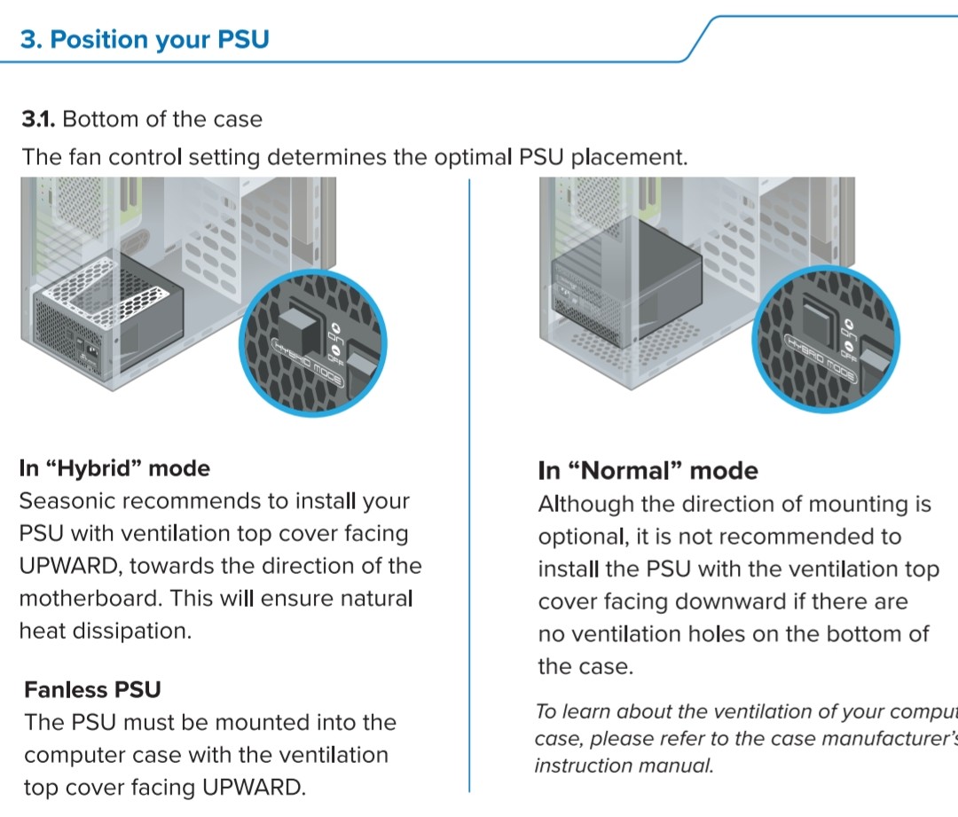 Ich habe jetzt Gehäuse u. Netzteil bekommen (Mainboard u. CPU fehlen noch) u. frage mich gerade wie herum das Netzteil (Ventilator des Netzteils nach oben o. unten gerichtet) in das Gehäuse eingesetzt werden sollte?