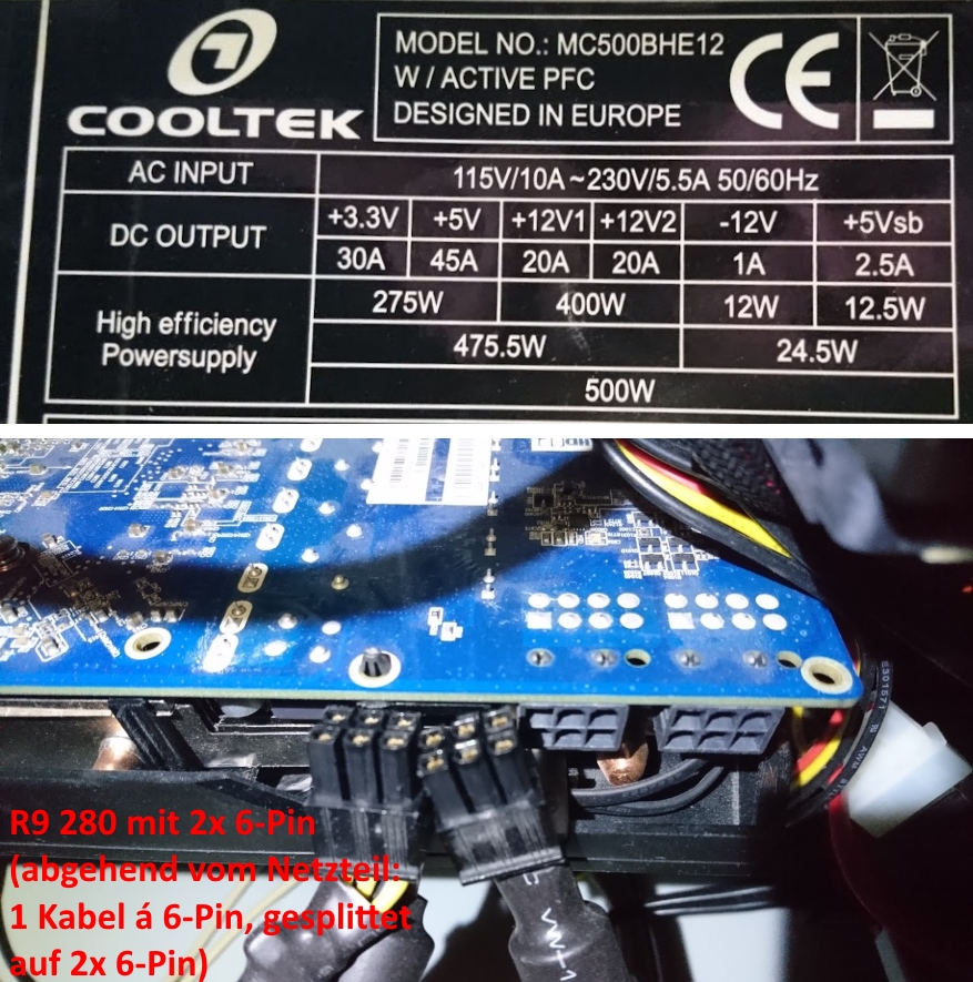 Das Netzteil versorgt einen PC mit i5 8400, 16 GB RAM, 1xSSD + 2xHDD, und eine Radeon R9 280 (Refresh der 7950, TDP = 200 Watt).