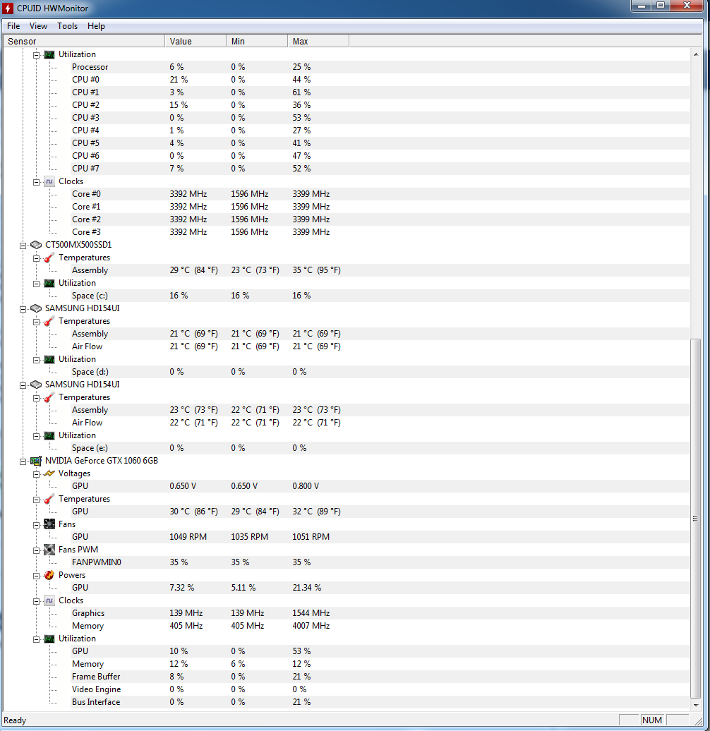 Satas: 1 SSD 500GB (CT500MX5 00SSD1 SCSI Disk Device) und 2x 1,5 TB Samsung HDDs