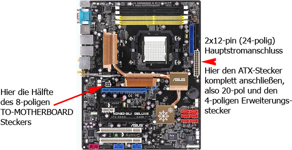 Okay, also entweder müsstest du den kleinen Strang von diesem Bild auf den 12V-Anschluss packen, oder aber, wenn der schon vom normalen ATX-Stecker verbraucht wird, die hälfte von diesem.