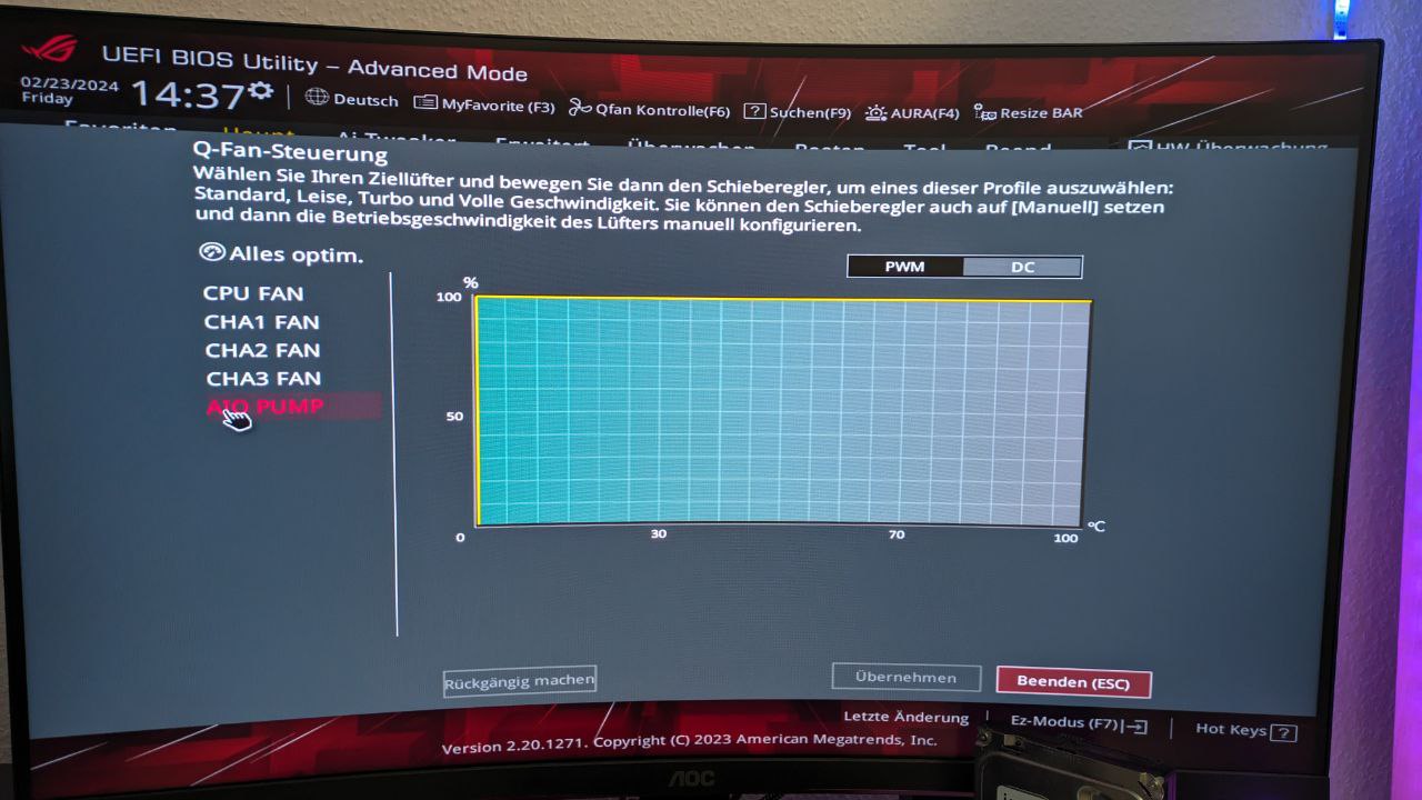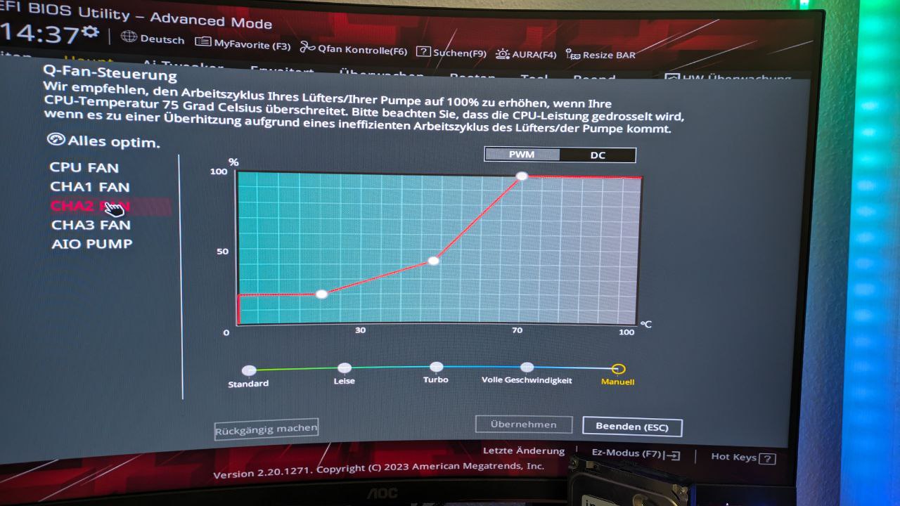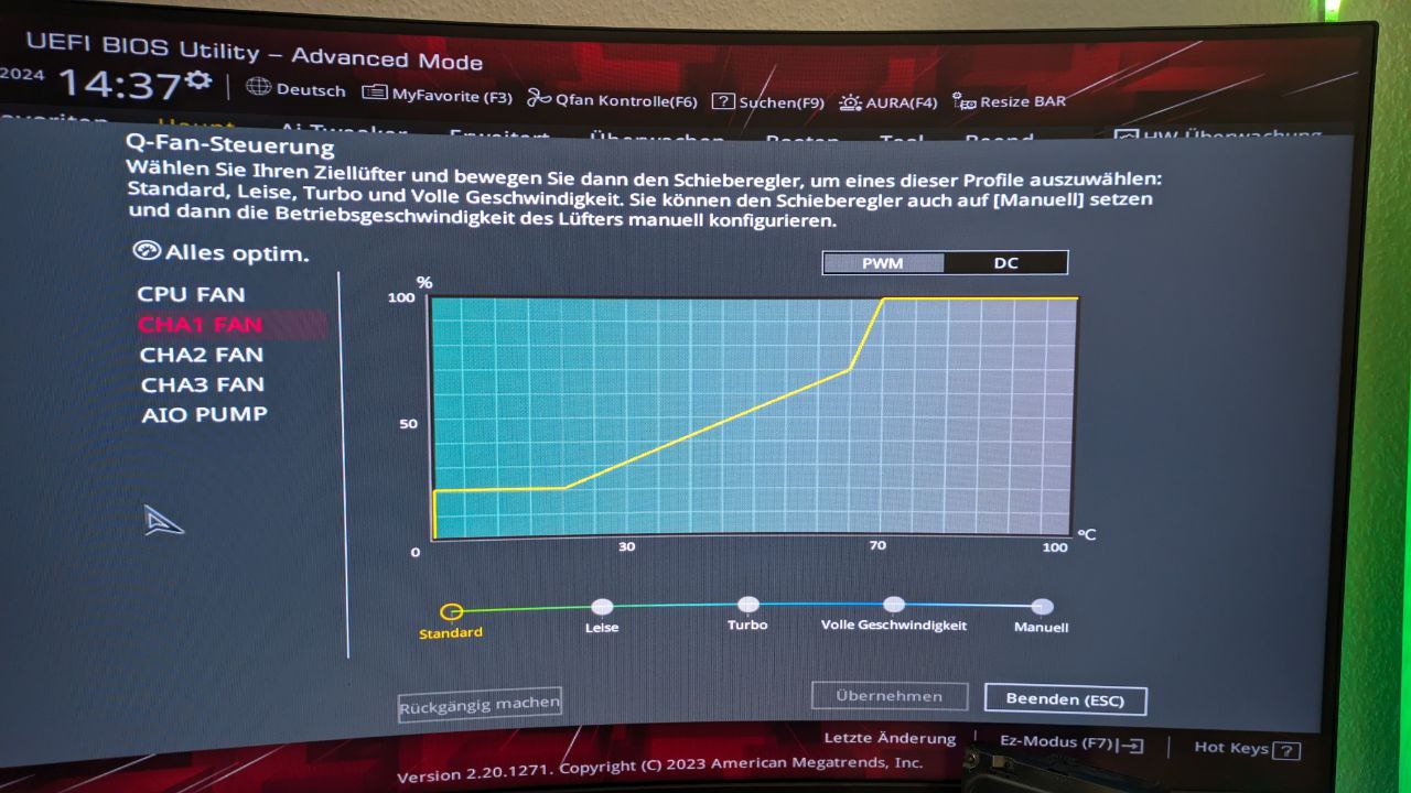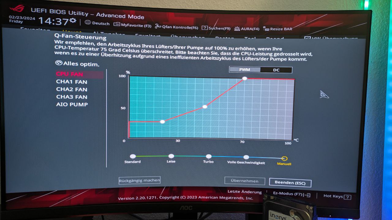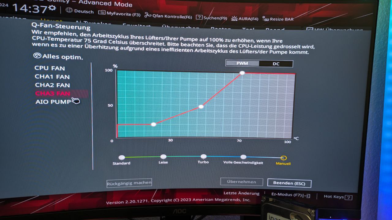 Es passiert meistens, wenn ich längere Zeit im Gaming bin, nach einer Stunde. Der Radiator ist dabei eine Richtige Heizung beim Dranfassen am Gehäuse. Die Temperatur ist meistens bei 70-80 Grad. Ich bekomme keine Fehlermeldungen und kein Bluescreen. Ich habe mit FurMark und Prime95 Stresstests gemacht und das mit HWinfo protokollieret, kurz vor dem Absturz bricht die 5V Spannung 4,66V zusammen, ob das so in Ordnung ist, bin ich überfragt. Das Netzteil wurde mehrfach mit einem Netzteil Tester überprüft, das NT läuft ohne Probleme. Die abstürzte treten meistens auf, wenn GPU und CPU zeitgleich belastet werden. Läuft die CPU aber im 65W Eco Mode passiert das nicht. Wenn der PC komplett abschaltet lässt er sich nicht mehr einschalten, erst nach ein paar Minuten wieder, was nach einem Temperatur problem klingt obwohl die CPU kein throttling hatte, der PC schaltete auch komplett ab, als ich Zeitgleich einen Stresstest starten wollte.