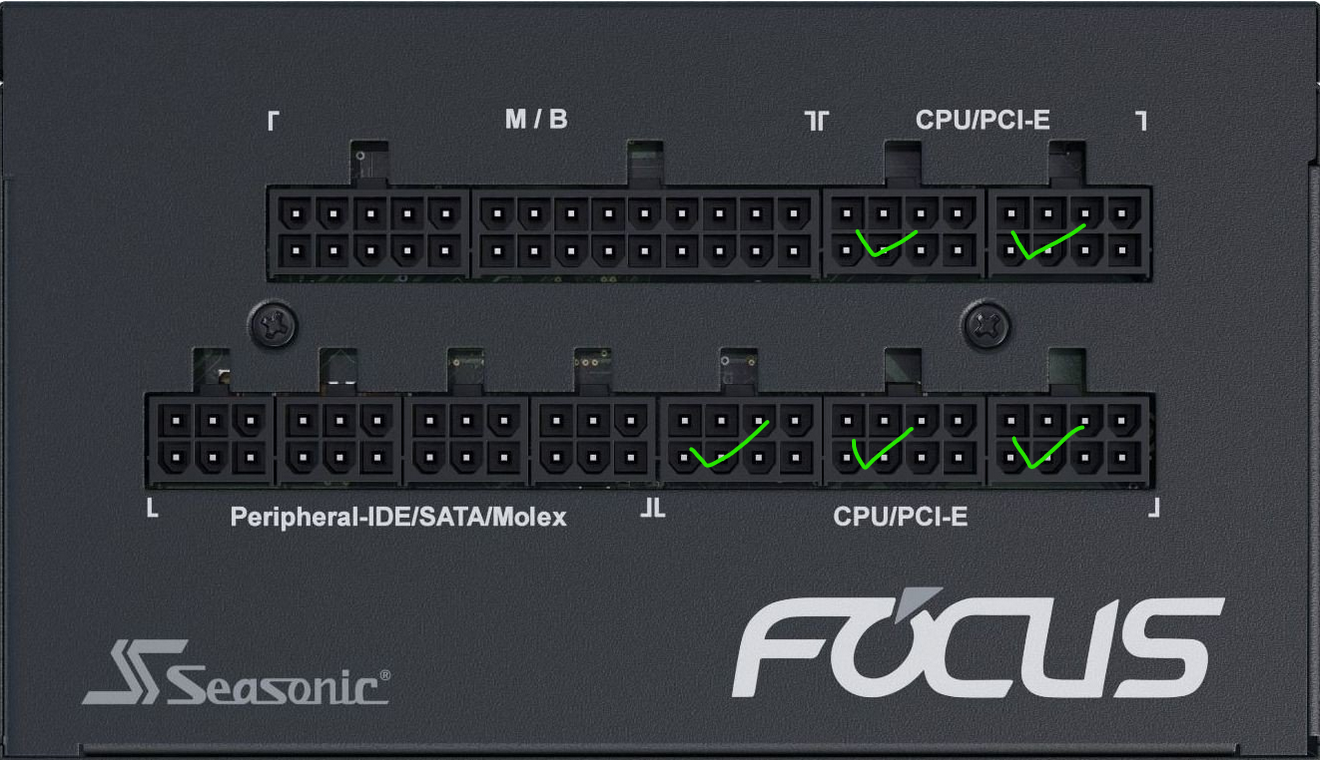 Auch die CPU (12V ESP) kommt an einen dieser PCIe Anschlüsse bei Seasonics.
