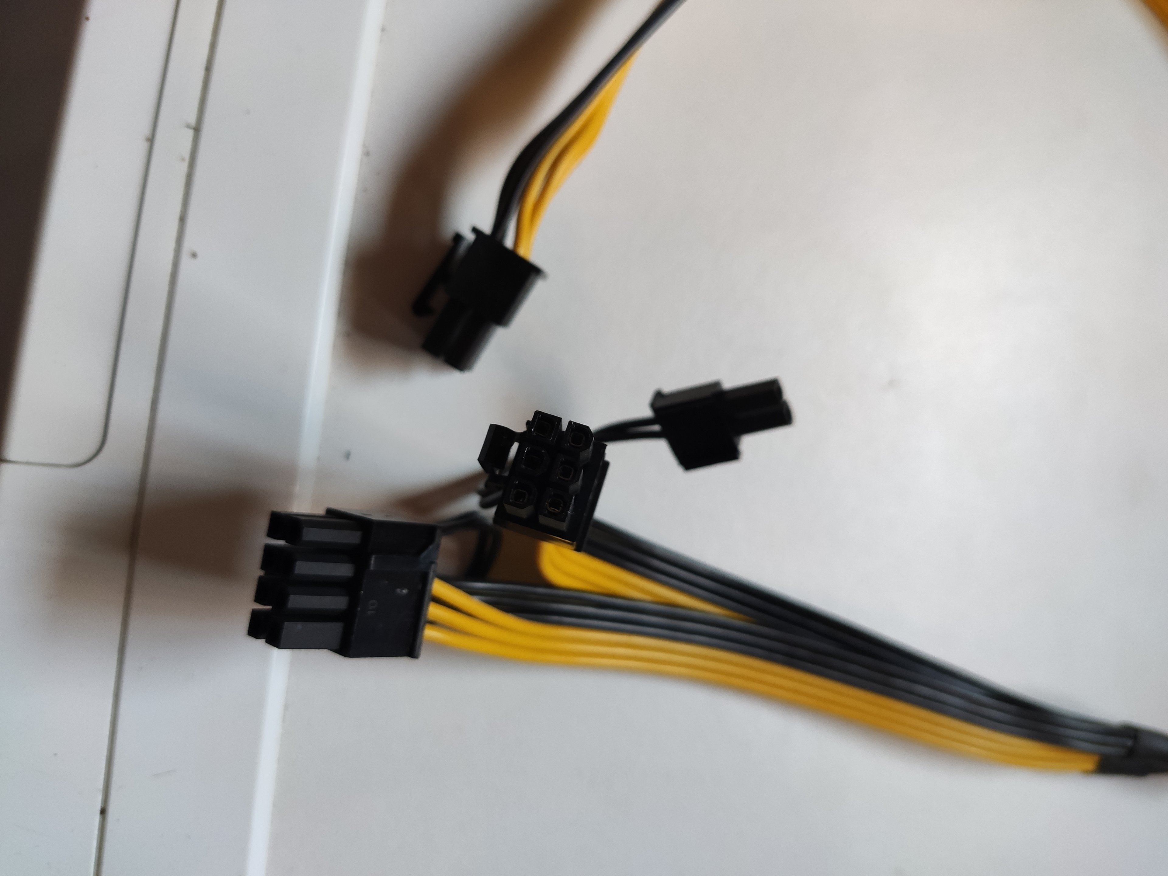 Woran kann das liegen? Ich habe schon ein anderes Kabel getestet, gleiches Problem. Auch habe ich am Netzteil einen anderen Anschluss versucht, auch keine Änderung. (Wie man auf dem Bild sieht, hat das Netzteil 2x 6 Pin frei.)