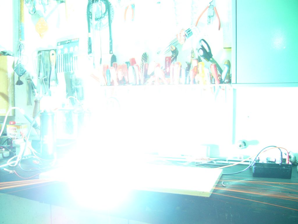 Nach dem Kurzschluss waren noch 200V drin. Somit sind lediglich 217J frei geworden, was sich aber in einem ohrenbetäubenden Knall und hellem Blitz geäußert hat, welcher locker jeden Sylvester-Chinaböller zur Knallerbse degradiert. Die momentane Leistung beträgt mehrere hundert Kilowatt.