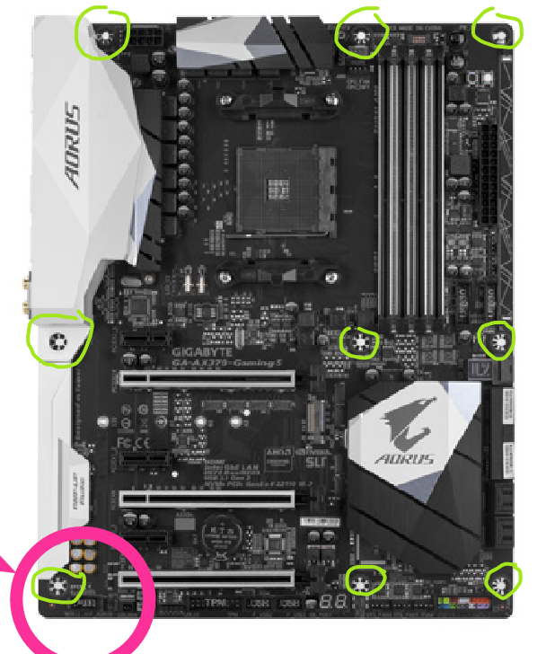 Speziell die unteren zwei roten Punkte im Posting #33 dürfen nicht sein wo sie sind; vergleich mal die sechs roten mit den neun gelben Markierungen; die beiden untersten roten liegen viel zu hoch, die drücken auf die Mainboard-Rückseite, wo sie nicht hingehören.