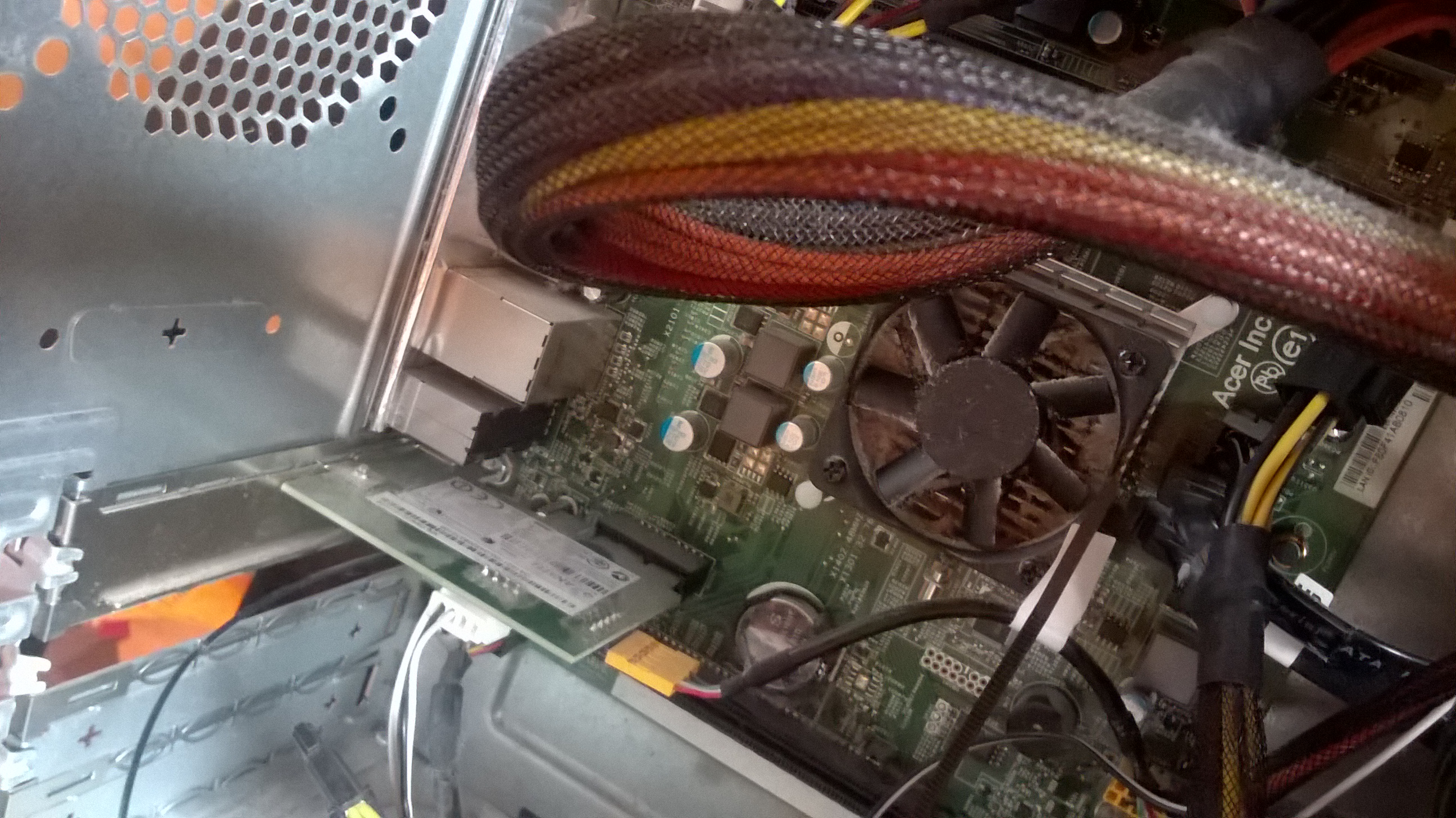 Ja, das ist die W-LAN Karte. Die sitzt auf einem PCI-e 1x Slot, der aber wohl nur zur Befestigung dient. Die Karte wird wohl über USB angesprochen (gelber Stecker). Die schwarzen und weißen Kabel sind die Antennen.