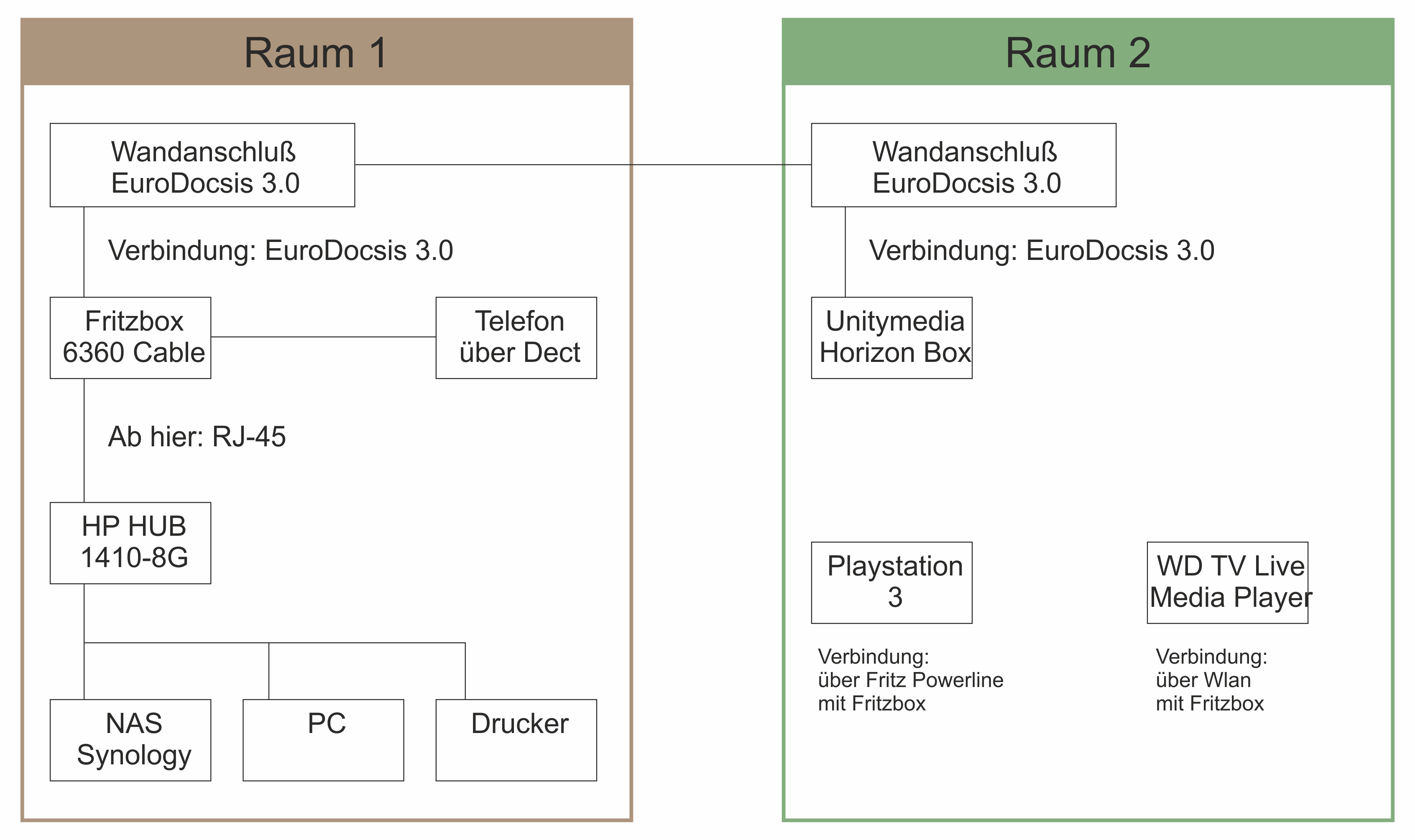 Im Raum 1 habe ich meine Fritzbox Cable (6360) daran über ein HP-HUB angeschlossen: PC's, Drucker und mein Synology NAS.
