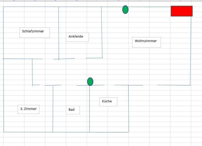 Die grünen Punkte sind die aktuellen Telefonanschlüsse. Wobei die ursprüngliche Dose die im Flur ist.