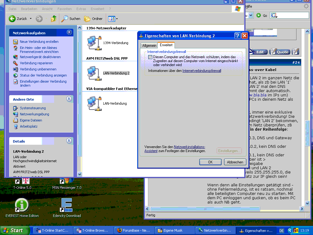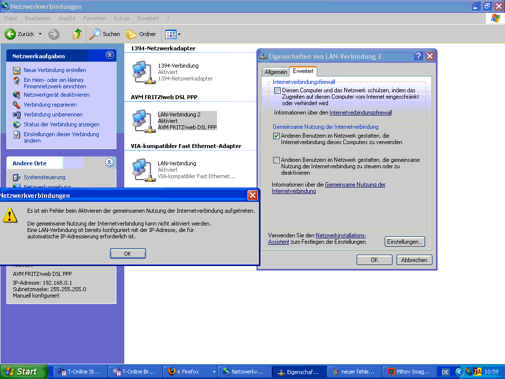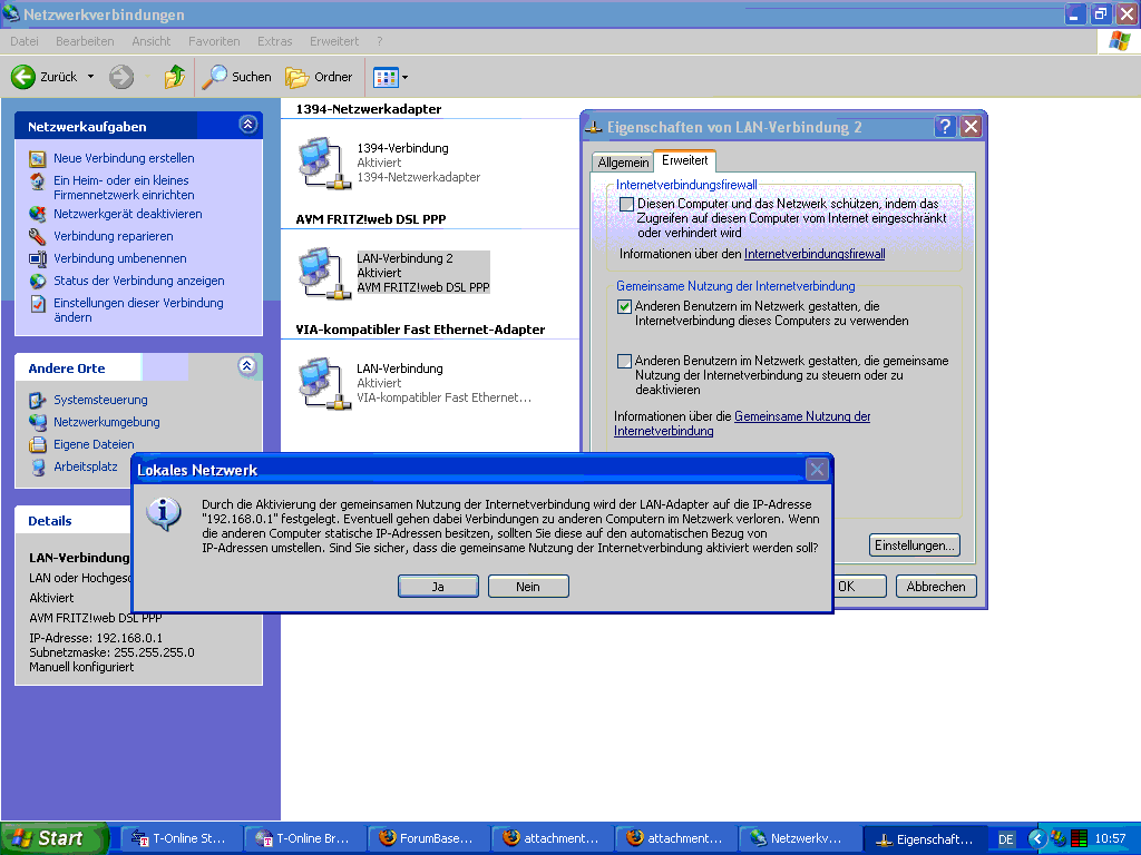 - den AVM 'LAN-Verbindung 2' auf 192.168.0.1/255.255.255.0 stellen und bei diesem Inetfreigabe einstellen