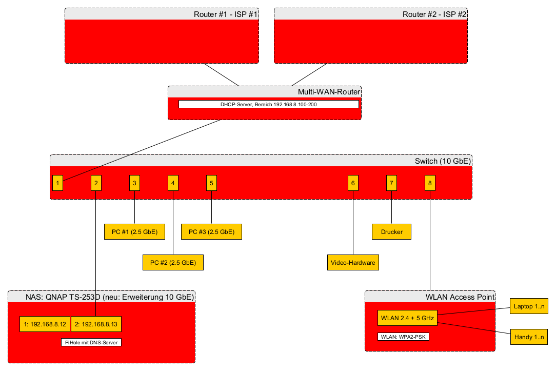 3) 2. Internetzugang durch zusätzlichen Router zur Optimierung der Ausfallsicherheit; Nebeneffekt wäre die Bandbreitenerhöhung.