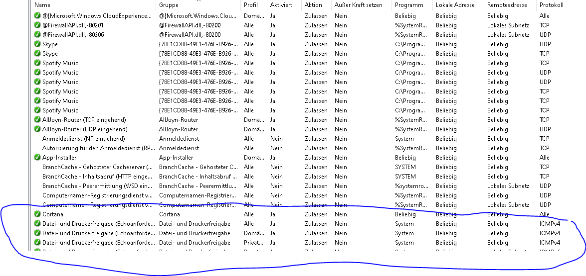 Das ist grundsätzlich erstmal schlecht, weil dieser Satz impliziert, dass du mehr oder weniger blind rumgeklickt hast. Hast du zB geprüft welches Profil der Firewall aktiv ist? Wenn Windows eine neue Netzwerkverbindung erkennt, poppt ein Fenster auf, in dem man auswählen kann ob es sich um öffentlich/privat/domäne handelt. Im öffentlichen Profil macht Windows in der Firewall weitestgehend dicht, während bei privat und domäne zahlreiche Dinge erlaubt werden. Das liegt daran, dass ein öffentliches Netzwerk als Bedrohung angesehen wird und ein privates Netzwerk als vertrauenswürdig. Fummelst du nun im öffentlichen Profil rum und erlaubst alles mögliche, verliert die Firewall an Wirkung, zB wenn du dich im Urlaub mit dem Laptop im Hotel-WLAN einloggst und der Gast am anderen Ende des Flurs plötzlich deine Dateifreigaben sieht, weil du im öffentlichen Profil die Firewall aufgemacht hast....