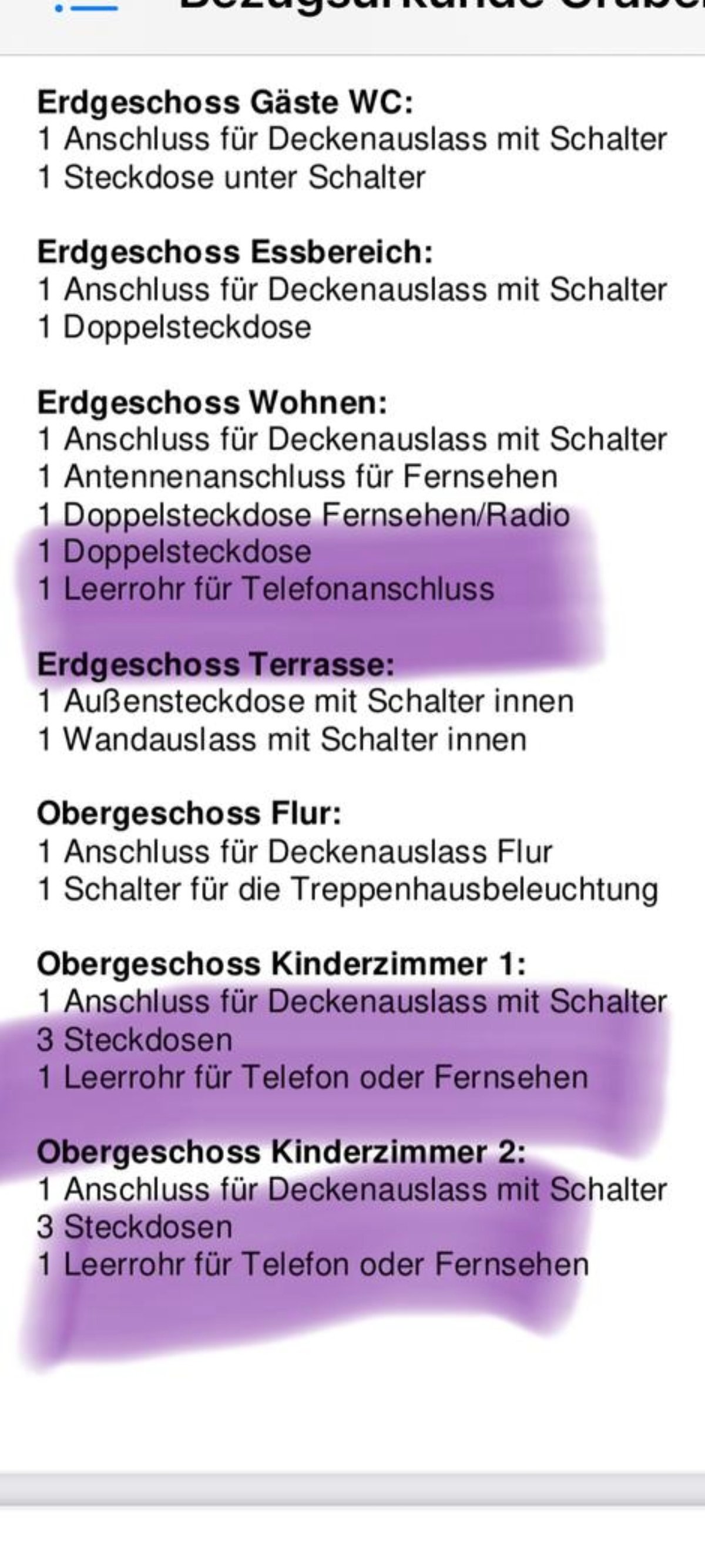 Laut Plan sind in allen Wohnräumen/Zimmern rote Kreise mit einem L drin (ich schätze das steht für Leerrohr) mit Schreibtisch gezeichnet. Laut Baubeschreibung werden zumindestens Leerrohr verlegt, für das nachträgliche ziehen von Telefon/SAT Kabeln. Daher meine Vermutung.
