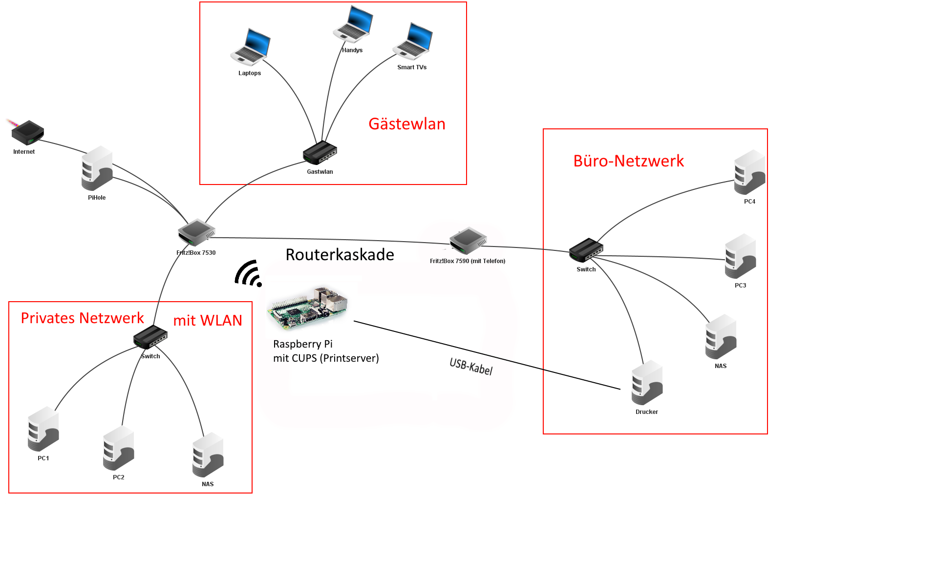 ich habe ein Heimnetz, dass wie im beigefügten Bild strukturiert ist. Nun möchte ich gerne einen gemeinsamen Drucker/Scanner einrichten, der aus dem Büro und dem privaten Netzwerk gleichermaßen erreichbar ist. Wie kann man das sinnvoll realisieren und dabei die Netzwerke trotzdem voneinander getrennt halten?