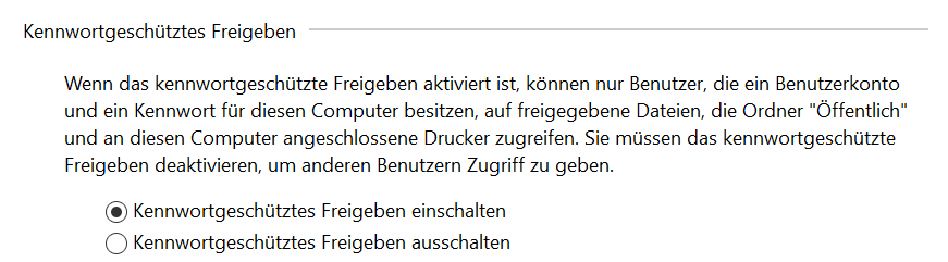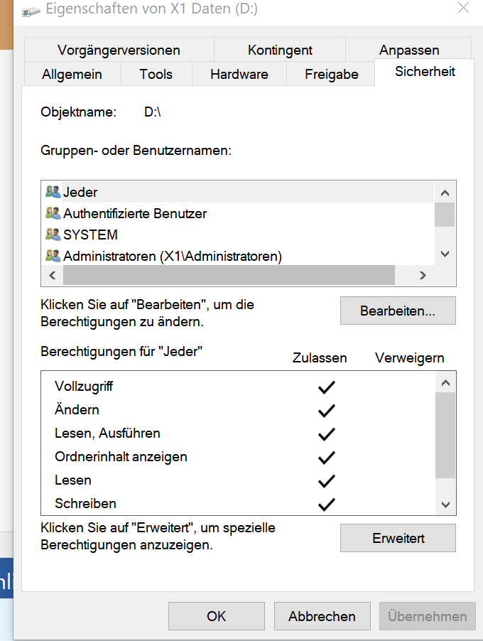 Aktuell zeigen die Netzwerkordner beider Notebooks den jeweils anderen an, aber der eine ("RZ") erwartet einen Benutzernamen und ein Passwort, wenn ich auf den anderen ("X1") zugreifen will. Aber X1 hat gar kein Passwort. Der andere ("X1") zeigt zwar die freigegebenen Ordner das ersten an, meldet aber "Auf \\RZ\D konnte nicht zugegriffen werden - Sie haben keine Berechtigung...", sobald ich auf den Ordner Klicke.