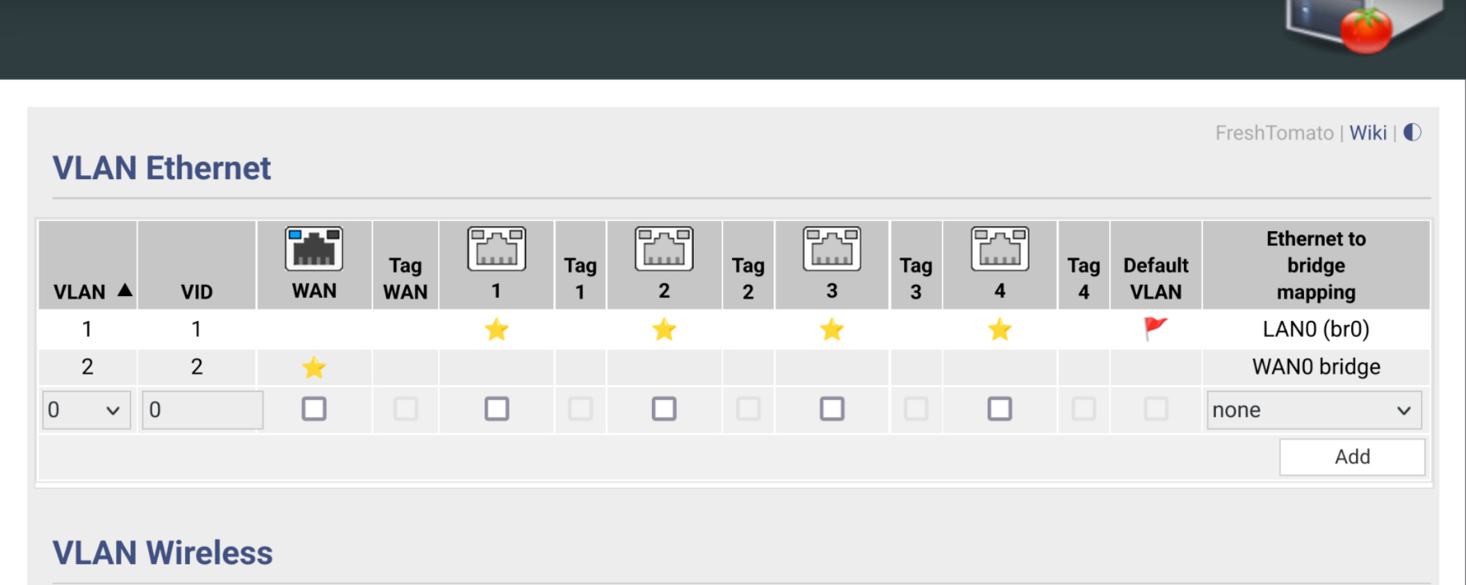 Update: Mittlerweile läuft es (schon seit einiger Zeit) wie gewünscht mit den VLANs. Es war sogar einfacher als gedacht in der Einrichtung, d.h. die physische LAN-Brücke war nicht notwendig. In Freshtomato konnte man einfach den WAN-Port des Routers als "tagged" festlegen, und diesen dann zwei verschiedenen VLANs zuweisen. Zum einen VLAN 100 für WAN, und zum anderen VLAN 200 für LAN.