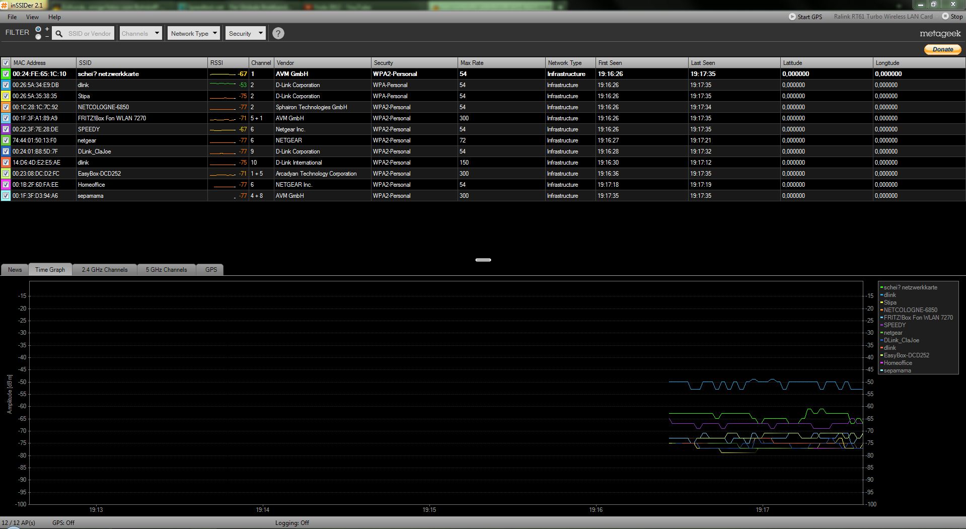 Meine Netzwerkkarte ist eine Ralink RT 61 (Treiberversion 3.0.1.0) , im Gerätemanager habe ich aber auch noch Cisco VPN und Realtek PCI GBE Family Controler unter Netzwerkadaptern aufgeführt.