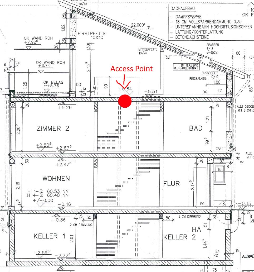 - Wo wird der UniFI AccessPoint idealerweise aufgehangen, um das ganze (oberirdische) Haus zu versorgen? Ich hätte jetzt an die Decke im Flur im OG gedacht (siehe angehängtes Bild). Am wichtigsten ist mir guter Empfang im EG sowie OG, DG ist nicht ganz so wichtig. Reicht da überhaupt ein AP? Der ausgesuchte LR-AP soll ja (zumindest mit passender Ländereinstellung) ordentlich Dampf haben.