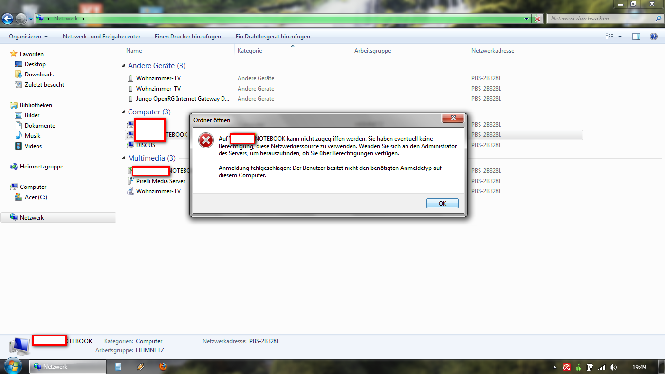 ich habe 2 Notebooks (Win 7 home premium), W-Lan - I-Net läuft auf beiden einwandfrei, von einem Rechner kann ich auf den 2. zugfreifen, vom anderen aber nicht. Wird zwar im Explorer angezeigt, wenn ich aber draufklicke, erhalte ich die Fehlermeldung "Auf NB kann nicht zugegriffen werden..." (Details siehe Screenshot).