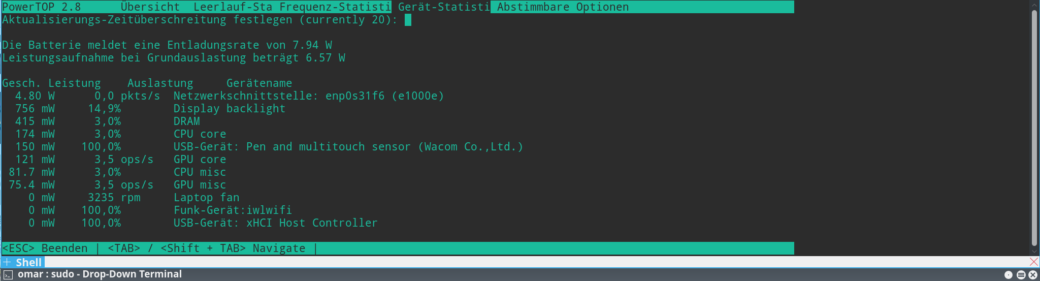 Mein Grafiktreiber funktioniert auf dieser Distro einwandfrei, nur verbraucht die "Netzwerkschnittstelle" komischerweise dauerhaft zwischen 4 und 6 Watt, egal ob das wlan an oder aus ist, wie man am Screenshot vom powertop erkennen kann.