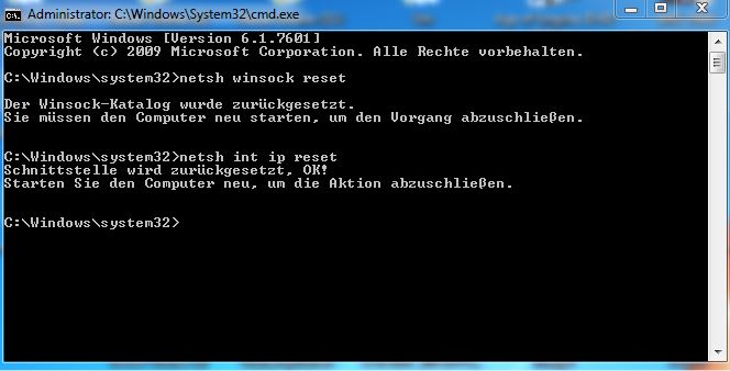 - IP-Reset über netsh int ip reset tcpreset.txt (http://router-faq.de/index.php?id=win7&win7=ipreset)
