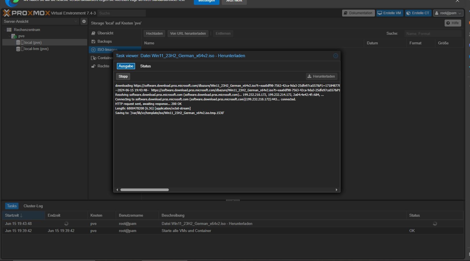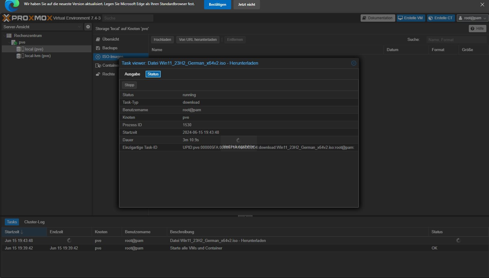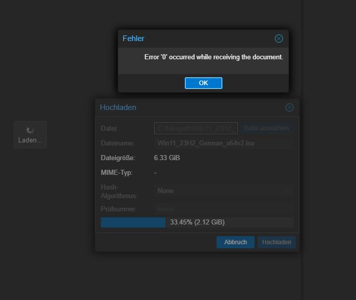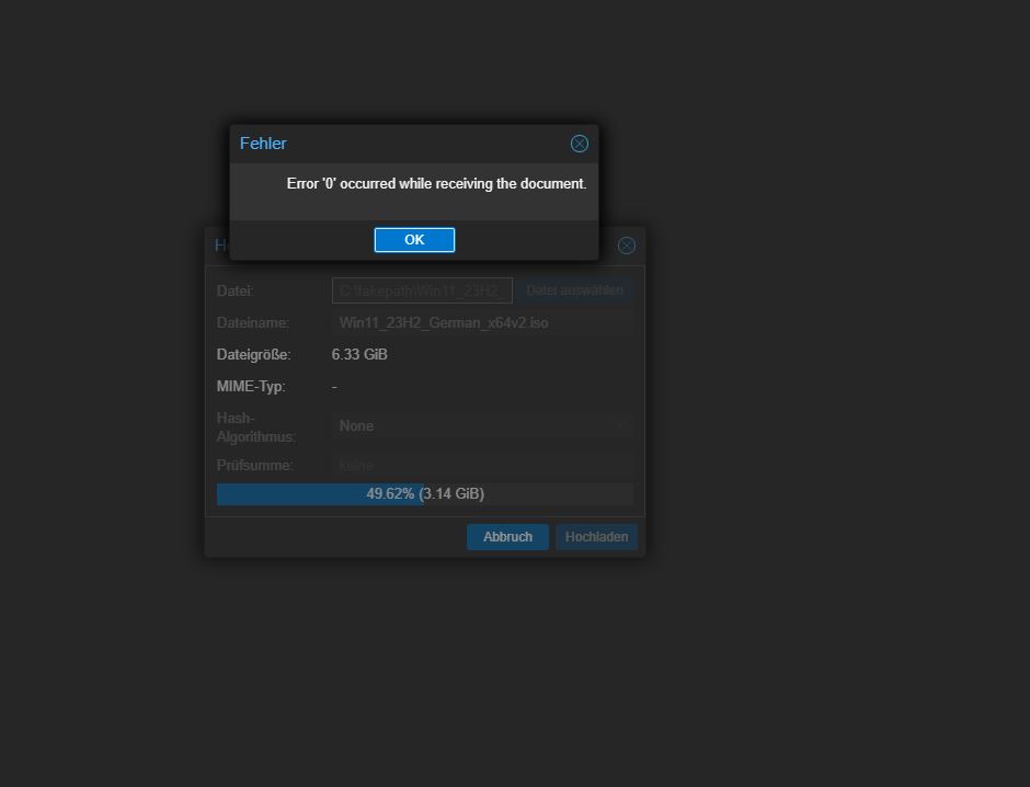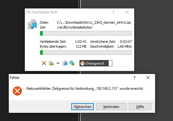 Immer beim Hochladen in der Proxmox/Oberfläche von einer Iso-Datei (z.B. Linux oder Windows11) bricht die Verbindung während des Uploads ab bzw. bleibt einfach hängen. Siehe Foto.