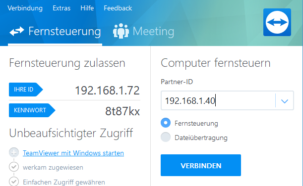 - am Notebook im Teamviewer die IP-Adresse des fernzusteuernden PC unter "Computer fernsteuern" eingeben