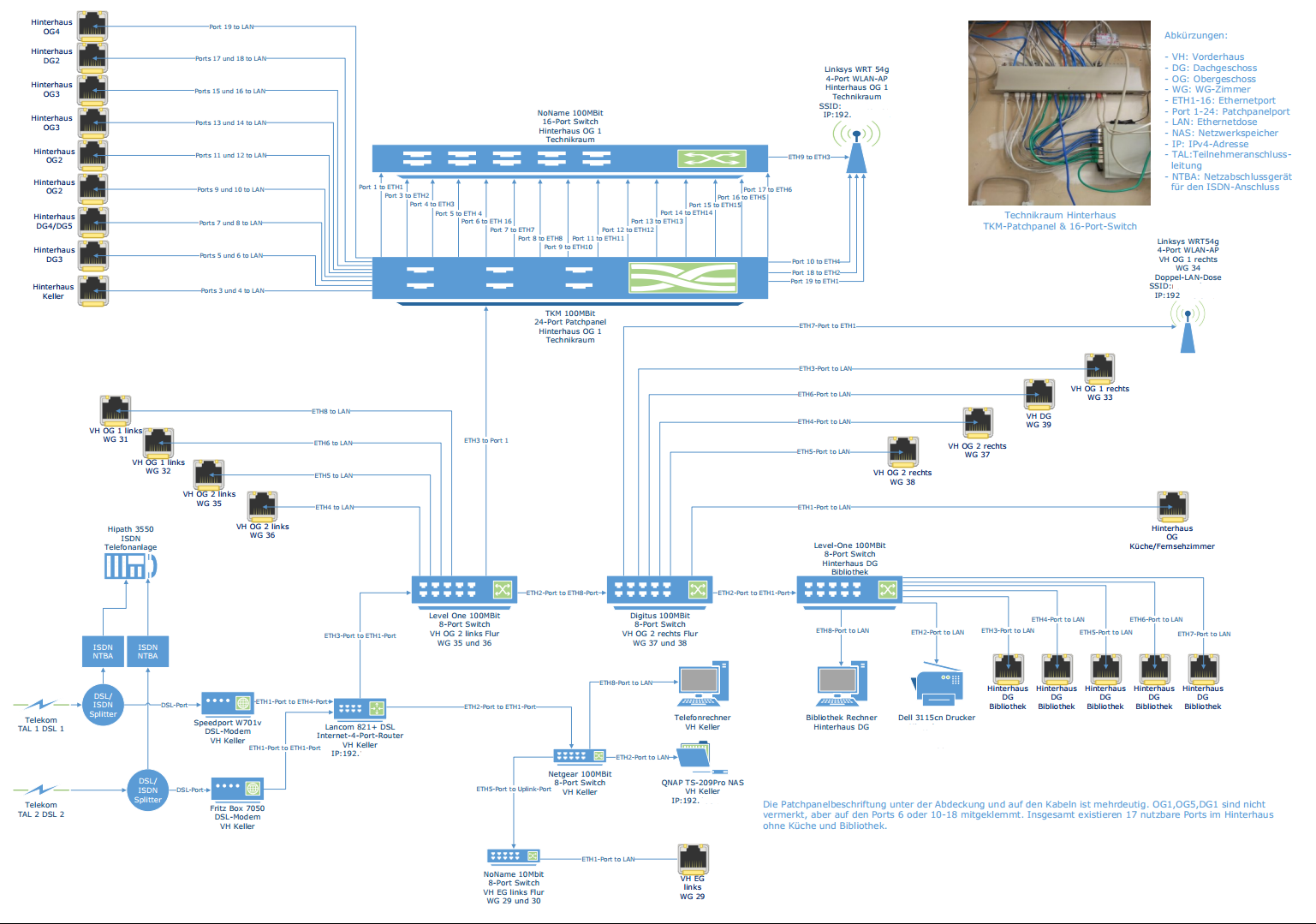 Wenn ich das Richtig verstehe, haben wir im Moment quasi zwei DSL 16000 Tarife an zwei Anschlüssen, die dann zusammen in das Netzwerk gehen. Einer meiner Mitbewohner hat einen Netzwerkplan erstellt, den ich mal zum besseren Verständnis anhänge. Demnächst sollen die beiden DSL-Anschlüsse wohl einer 100 000er Leitung des lokalen Kabelkanbieters weichen. Neben dem Internet haben wir noch eine ISDN-Telefonanlage mit über 25 Endgeräten (jedes hat seine eigene Nummer, auch wenn man von extern anruft), die auch weiter bestehen soll.