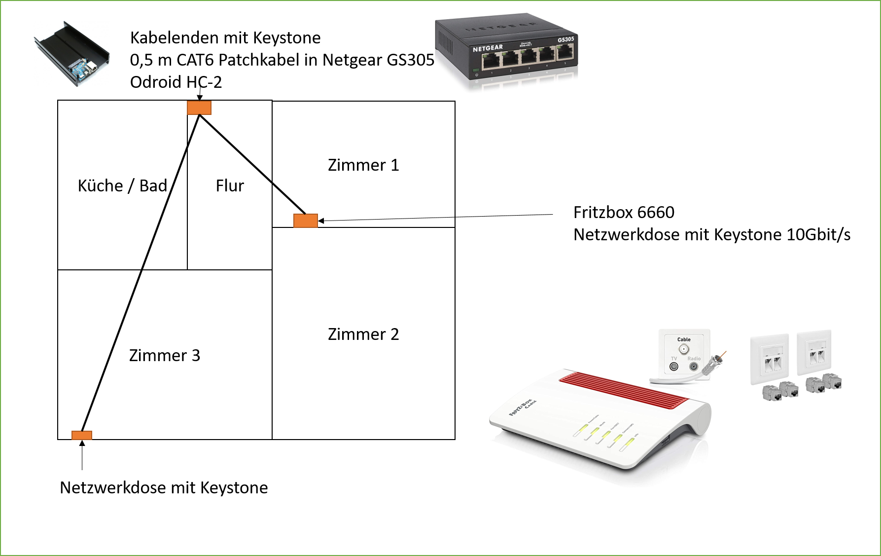 ich habe ein Problem mit meinem Netzwerk in meiner Mietswohnung. In Zimmer 3 (siehe Grafik) kommt kein 1 Gbit/s mehr über die Leitung in der Wand an. Alle Netzwerkgeräte verbinden sich nur mit 100 Mbit/s. Am Netgear-Switch im Flur kommt 1 Gbit/s an.
