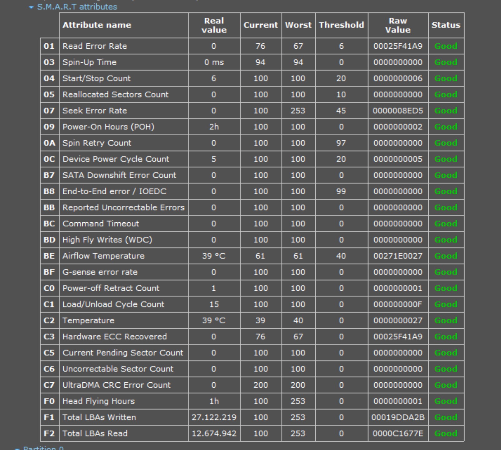 Umgekehrt kenne ich es bei Seagate, der einzige Hersteller, wo einige Werte eben Hexadezimal codiert sind und von einigen Prüfprogrammen falsch umgerechnet/ausgewertet werden.Inzersdorfer schrieb:Die Werte 01-Lesefehler und 07-Suchfehler sind bei Seagate geteilt auszuwertende hexadezimale Rohwerte.