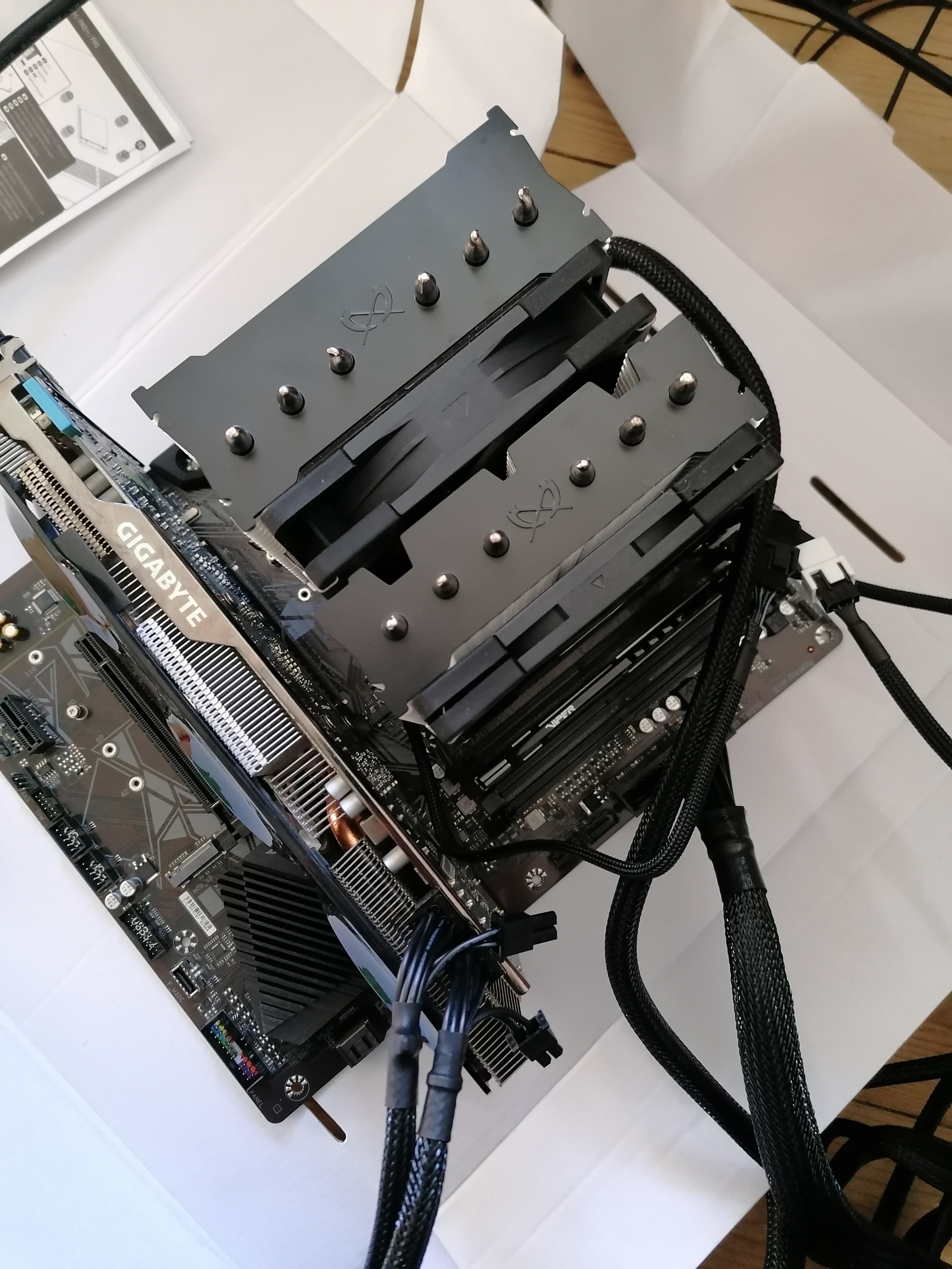 Noch was, mit solch ein Test das Netzteil hochkant hinstellen, sodass der Lüfter zur Seite zeigt. Es geht darum, dass der Lüfter des Netzteils frei liegt, aber auch nicht nach oben zeigt, wo was hineinfallen könnte.