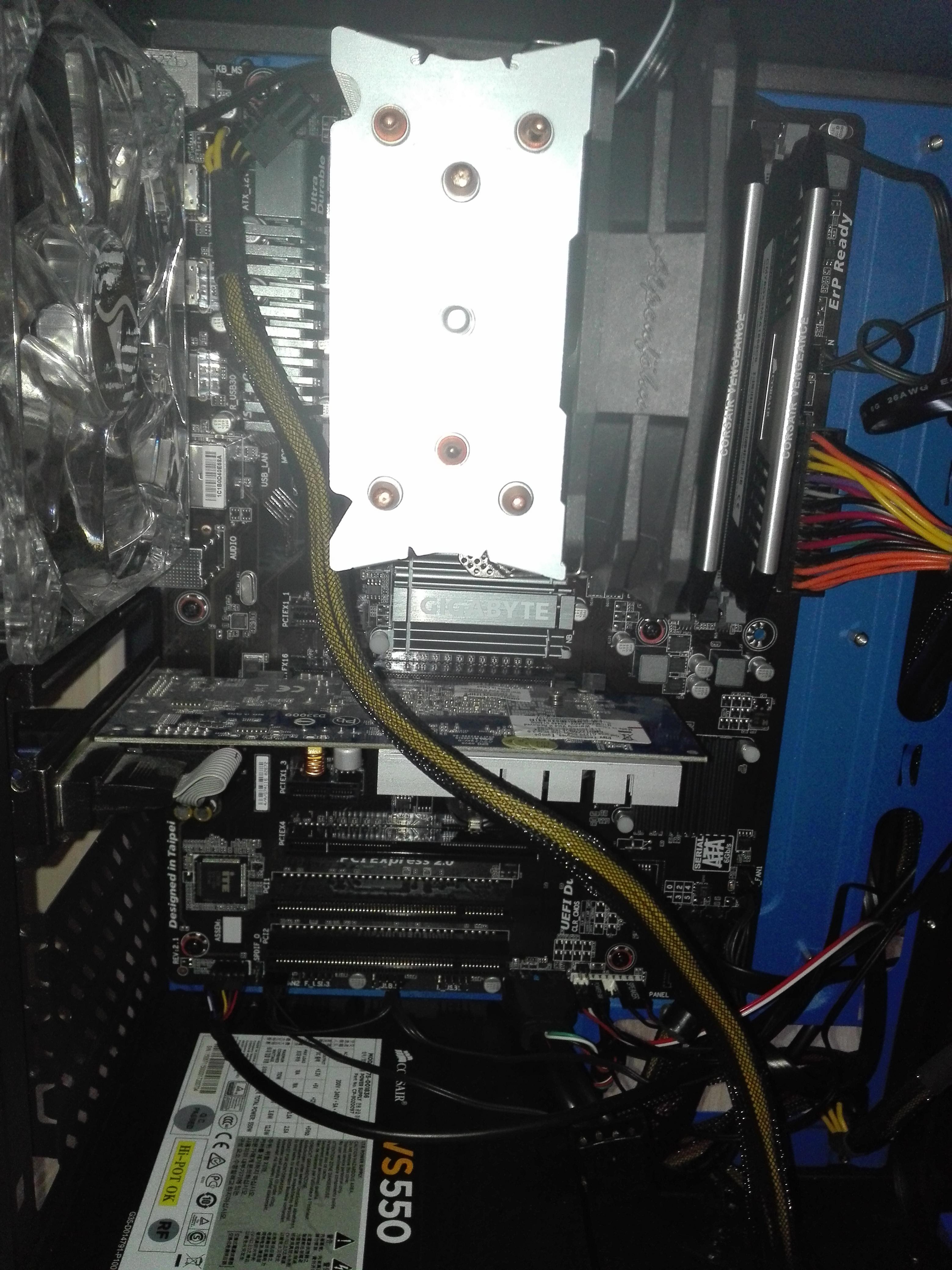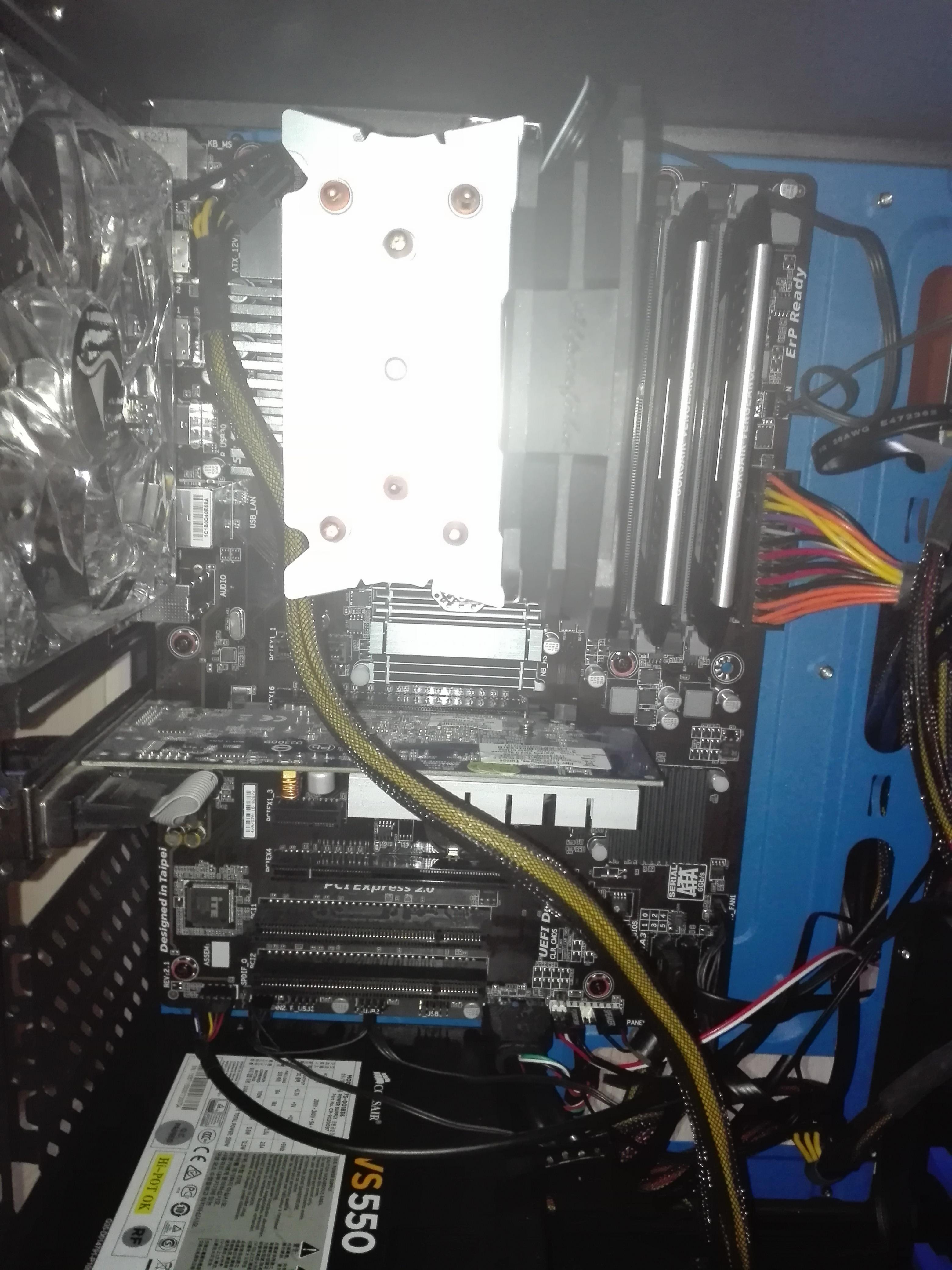 Steck das NT ab alle Kabeln runter bau das NT zuerst aus dann das Board CPU und Kühler so wie Rams kannste drauf lassen, auf einen Tisch oder Karton das Board drauf legen dann das NT wieder anschliessen und die PWR pins kannste z.b mit nem Schraubendreher brücken. Sollte hier immer noch kein Bild erscheinen nimm 3 Rams runter und lass nur 1 stecken das gleiche nochmal testen ob Bild kommt?