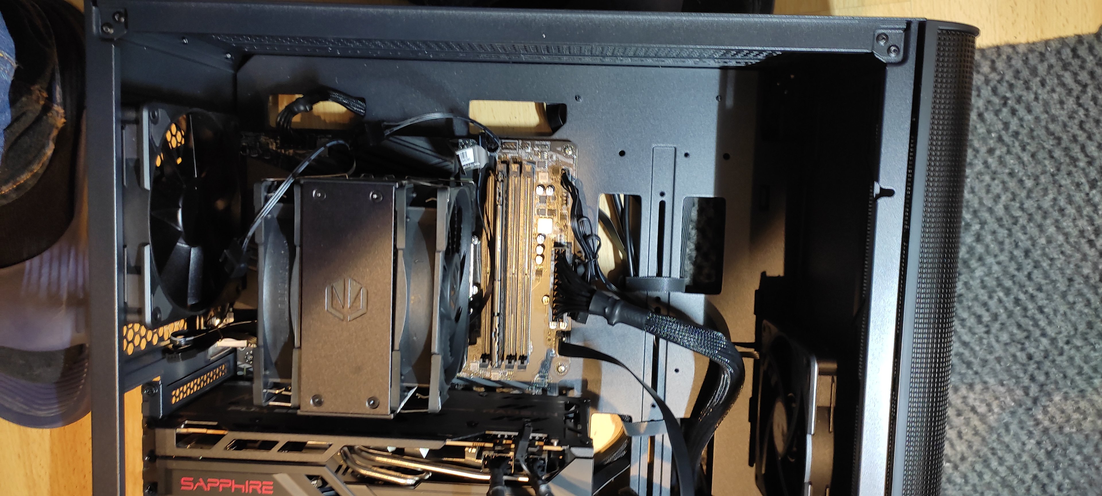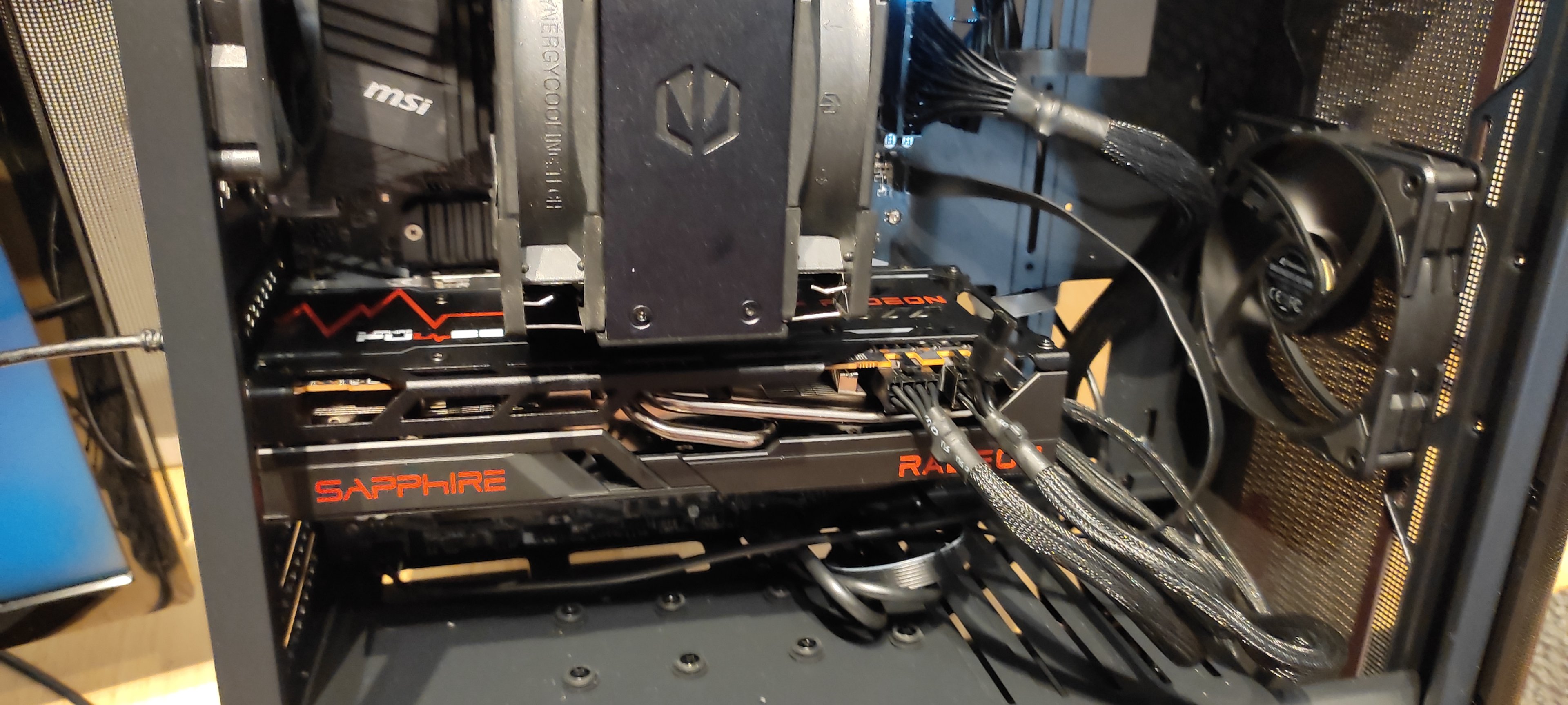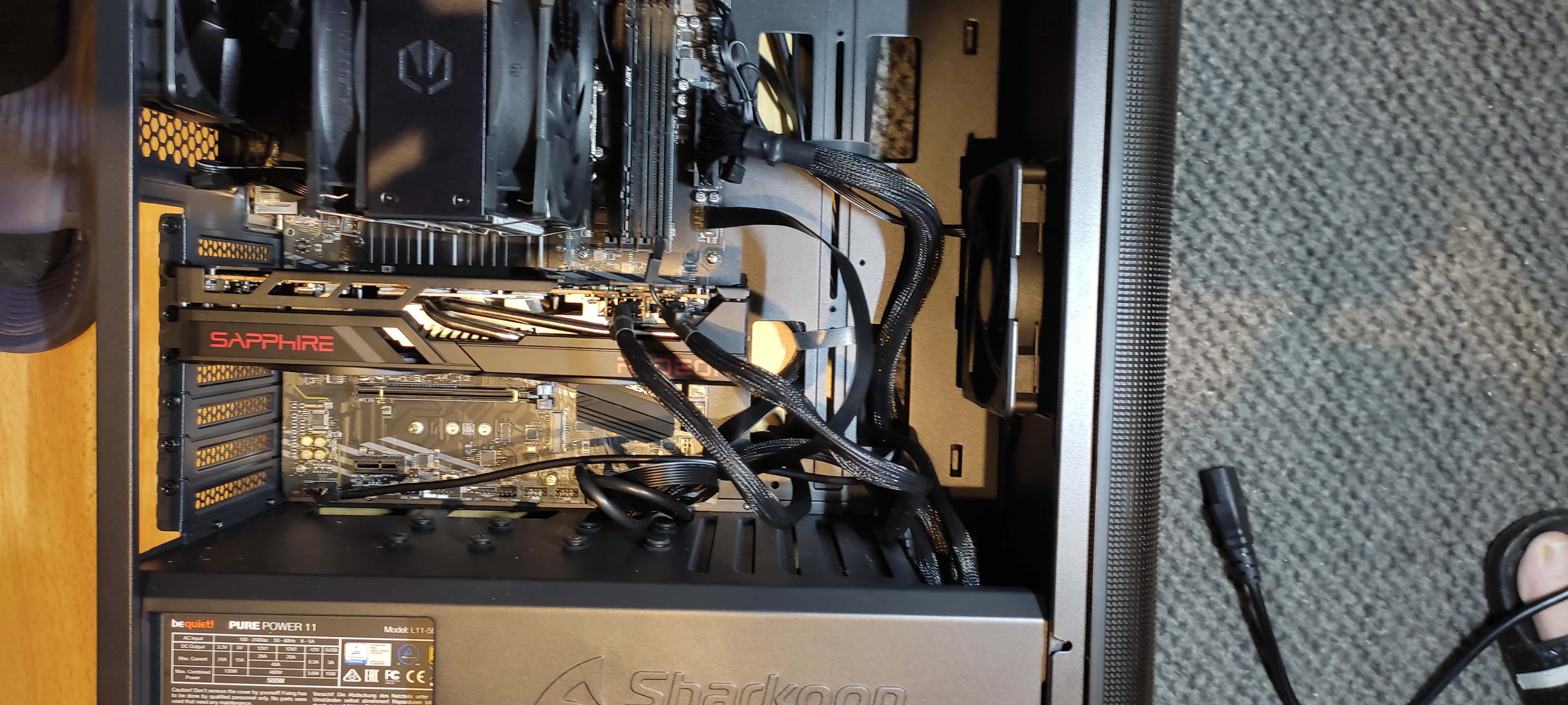 Der Einbau hat auch erstmal funktioniert, allerdings bekommen wir kein Bild nach Anschalten des PC's. Dieser läuft auch hörbar und die Lüftung des Netzteils und des CPU-Kühlers rackern (die der Grafikkarte drehen sich allerdings nicht?). Der PC wurde auch schon an verschiedene Monitore angeschlossen, aber es gibt einfach kein Bild (aber auch keine Pieptöne wie man das z.B. von beschädigen Speicherriegeln (?) kennt)