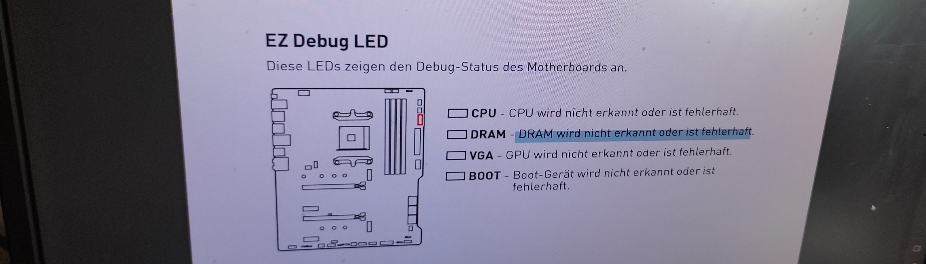 EDIT: Das Mainboard hat keine Lautsprecher, stattdessen leuchtet eine LED, welche auf ein Problem mit dem Speicher hinweist).