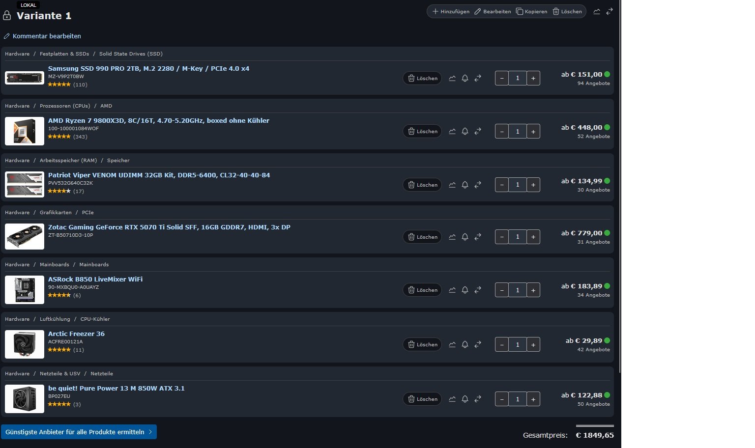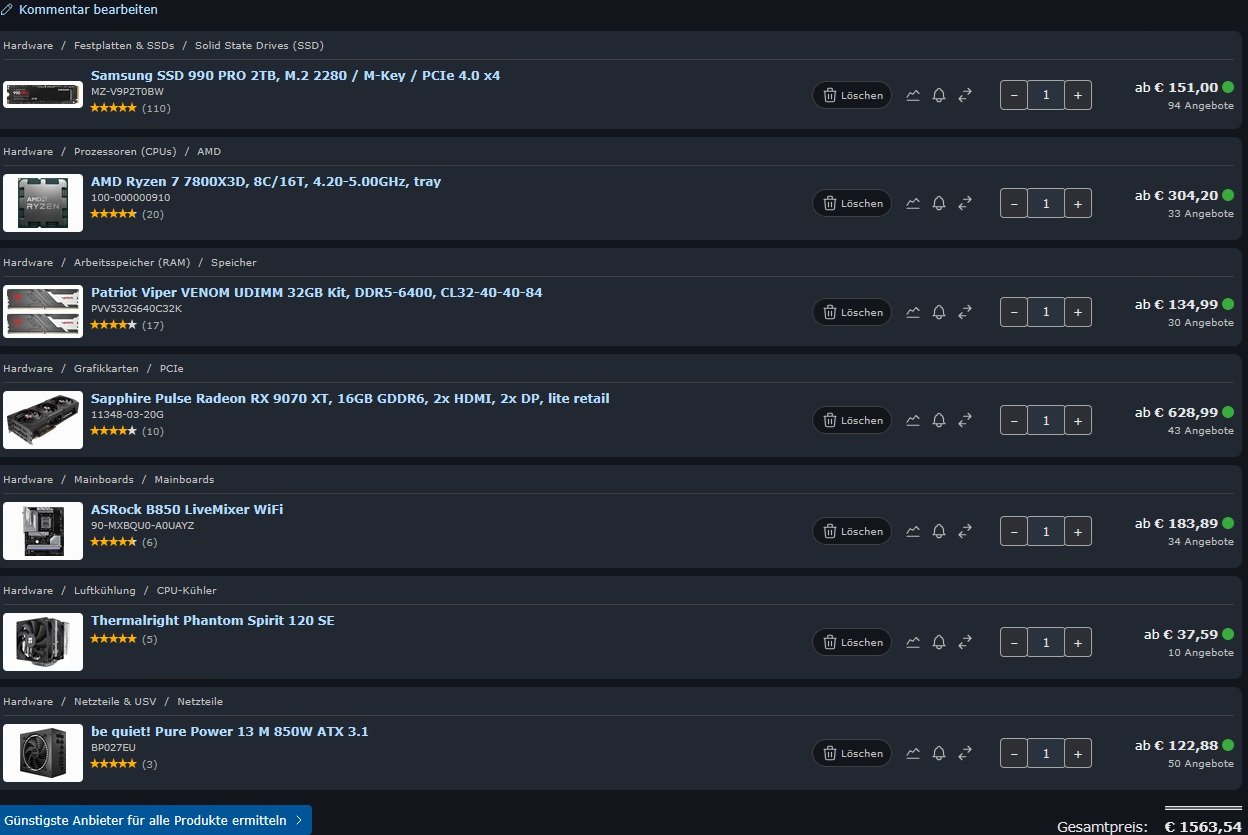 Beim Mainboard und der Grafikkarte bin ich mir noch unschlüssig; eventuell kommt auch eine RTX 5070 Ti in Frage.
