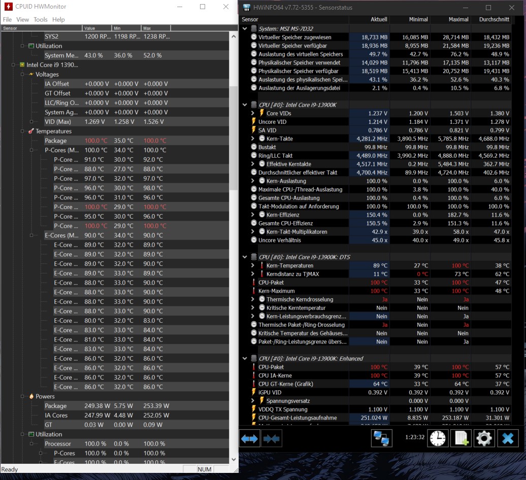 Also hab ich mal ein wenig Monitoring ausprobiert und siehe da: nach wenigen Sekunden "shader compilieren" sind meine CPU Kerne auf 100° und Throttling setzt ein. Was dazu führt dass das Game einfach einfriert oder direkt abstürzt. (Cyberpunk oder sogar Monster Hunter Rise). Cinebench R23 bricht nach nicht mal 2 Minuten ab weil schon mindestens 4 Kerne bei 100C sind (Bluescreen).