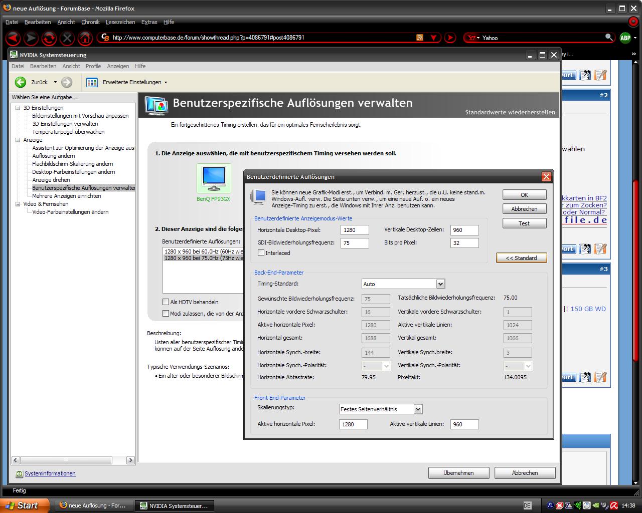 HAllo Leute, möchte mir eine Auflösung in der NNvidia Systemsteuerung erstellen. Unter Vista konnte ich mit meiner 8800 GT eine Auflösung von 1200x800 oder so in der Art erstellen, ich kann aber auf meinem 22 Zoll 16:10 Bildschirm nur 4:3 Modi einstellen. Mlöchte aber eine BReitbildauflösung