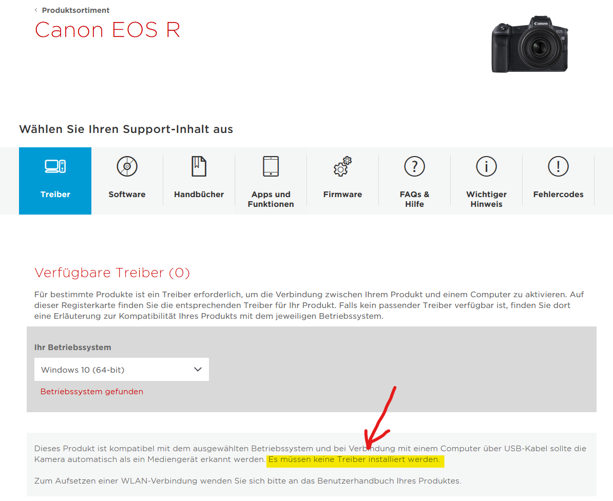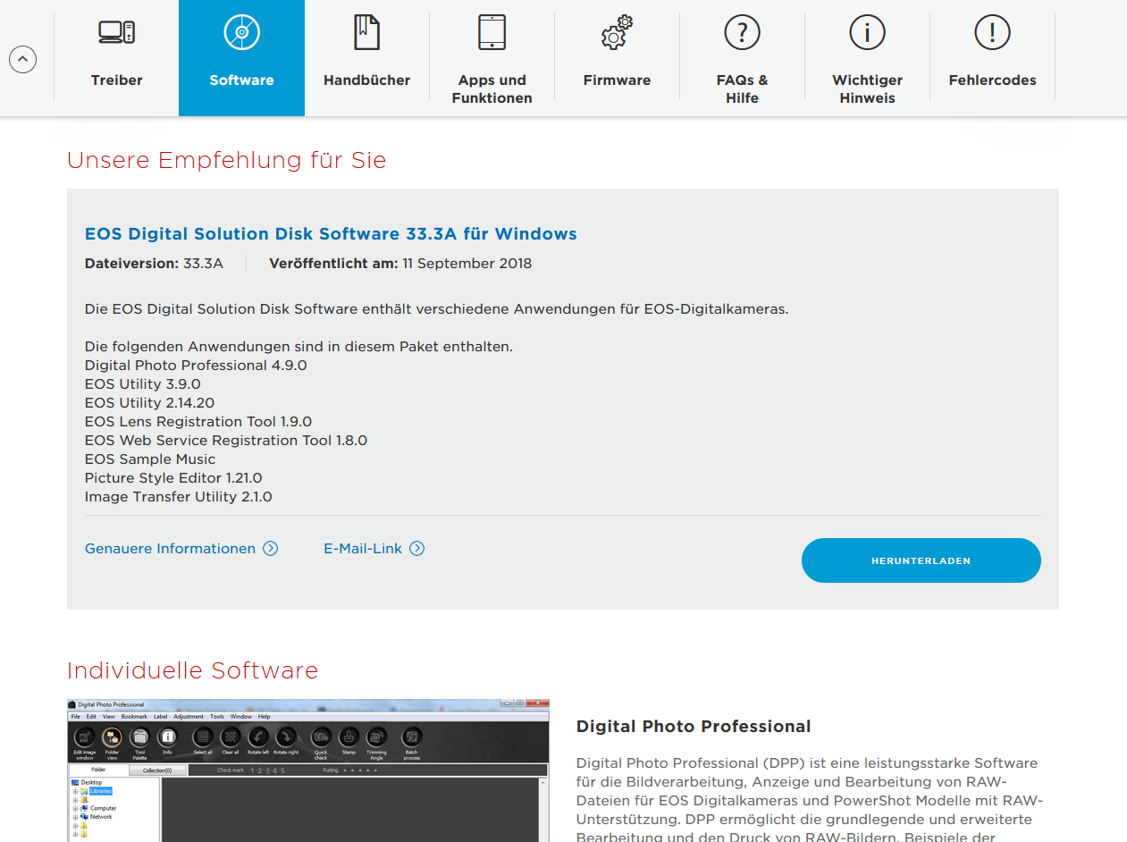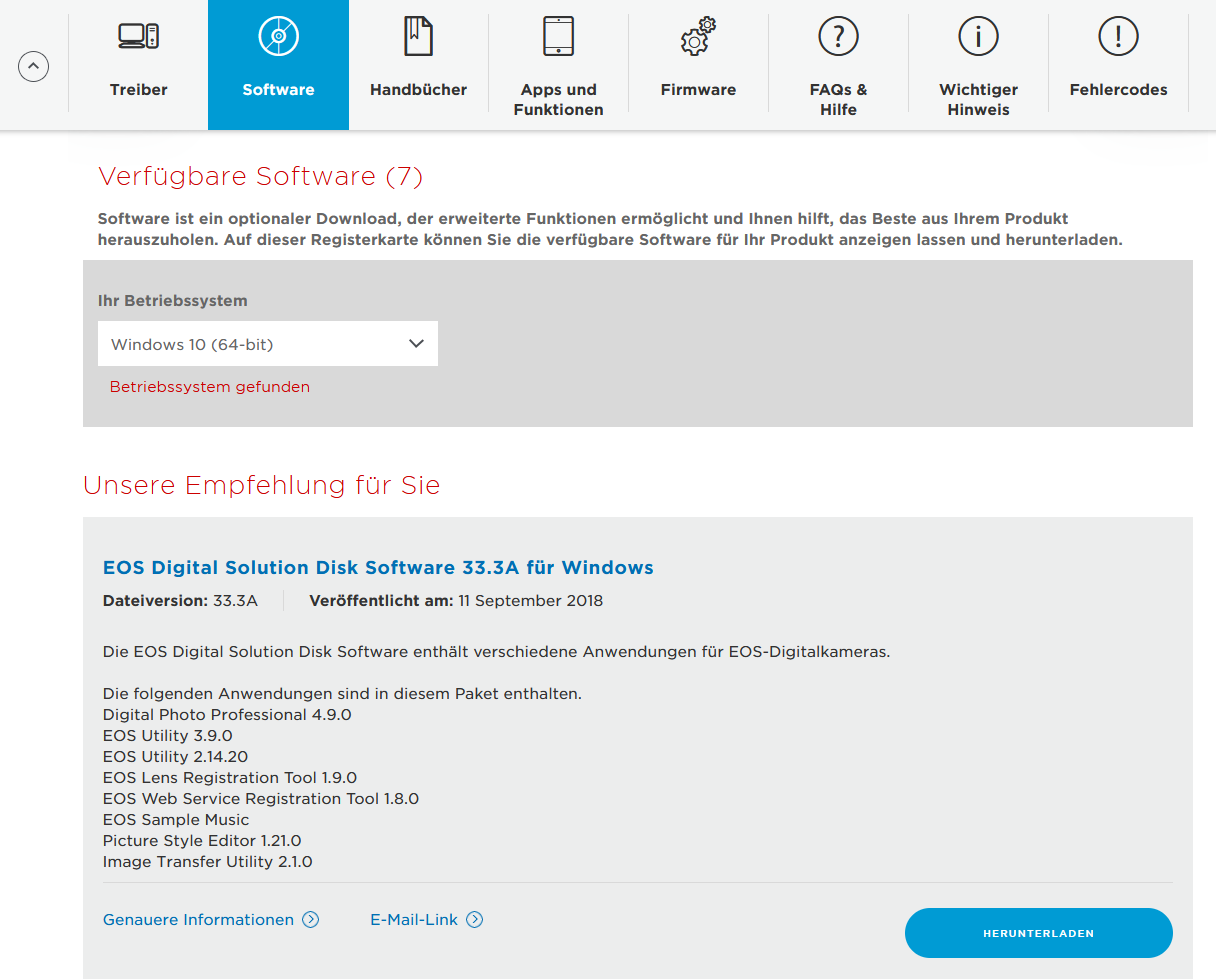 nein, die links hinter den Icons reagieren einfach nicht. Es müsste ein drop-down Menü aufgehen das z. B. bei Software die Programme Digital Photo Professional, EOS MOVIE Utility, EOS Utility, ImageBrowser EX, Picture Style Editor, PhotoStitch, EOS Movie Plugin sowie einen link zum Canon RAW Codec auflistet von wo der link zu den downloads durch anclicken folgt - aber es passiert einfach nichts beim click auf das Feld Software.