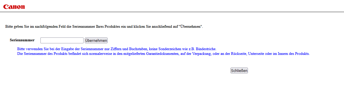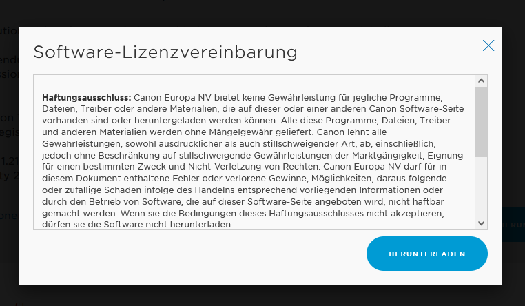 Wenn ich auf die Canon-Seite gehe und dann bei der angezeigten Software auf "Herunterladen" klicke, bekomme ich das Overlay-Fenster mit der Software-Lizenzvereinbarung angezeigt. Wenn ich hier auch auf "Herunterladen" klicke öffnet sich in einem neuen Tab die Seite zur Eingabe einer Seriennummer.