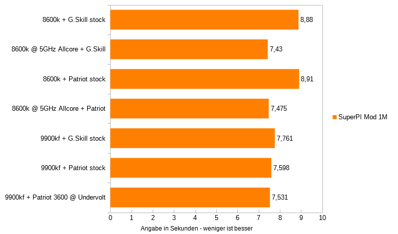 TLDR; Der Core i5-8600K macht auch 2021 noch eine sehr gute Figur und zeigt sich besonders von Seiten der Energieeffizienz als sehr ausgewogen. Ein Upgrade auf eine i9-CPU der 9. Core-Generation von Intel macht nur sehr eingeschränkt Sinn.und G.Skill RipJaws V 3200 vs. Patriot Viper Steel 4000