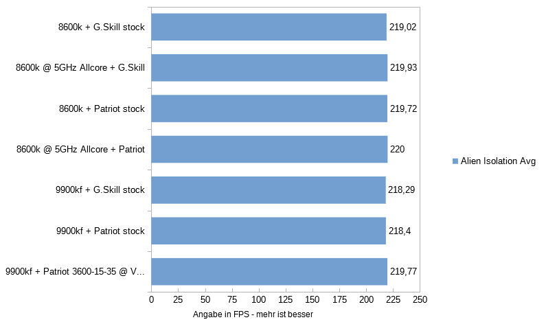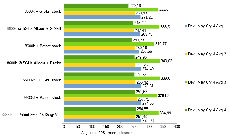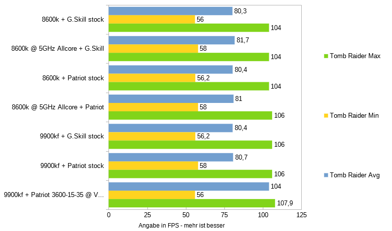 Ebenso auffallend ist, dass die Durchschnitts- und besonders die Max-FPS in diesem Setup selbst hinter den Stock-Werten des i5-8600K hinterher hinken. Wie bereits im Valley-Benchmark sowie in sämtlichen Multicore-Anwendungen scheint sich die Besonderheit mit dem übertakteten RAM in Verbindung mit dem 9900 KF auch im Spiele-Parcours fortzusetzen, aber es zeigt auch, dass man eben nicht auf die Schnelle durch simples Übertakten einzelner Komponenten pauschal große Leistungssprünge sowie einen weiterhin gewährleisteten, stabilen Betrieb des Rechners erwarten darf.