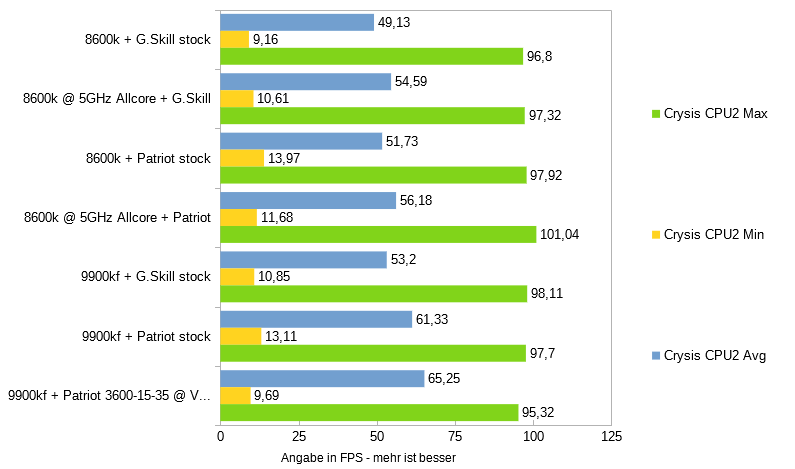 Auch der scharf getaktete Patriot-RAM mit 3600 MHz und 15-15-15-35er Timings kann die Partie nicht für sich entscheiden. In zwei Sonderfällen, namentlich dem CPU2-Benchmark von Crysis sowie dem im Jahre 2013 neu aufgelegten Reboot von Tomb Raider kann der Patriot-RAM mit dem i9-9900KF den Rest des Feldes merklich hinter sich lassen.