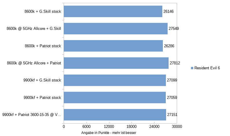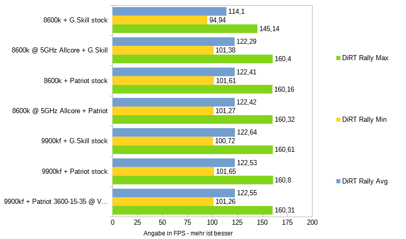 Wird der Core i5-8600K auf 5 GHz übertaktet, schrumpft der Vorsprung des i9 mit Patriot-RAM auf 3,3% mit den beiden erwähnten DiRT-Titeln, ohne diese ist es sogar nur noch ein magerer Prozentpunkt Vorsprung. Der Patriot-Speicher kann dem i5-8600K hier nochmals minimal unter die Arme greifen, sodass er bei 5 GHz Allcore und ohne die beiden DiRT-Titel sogar exakt gleichauf mit dem i9-9900KF arbeitet.