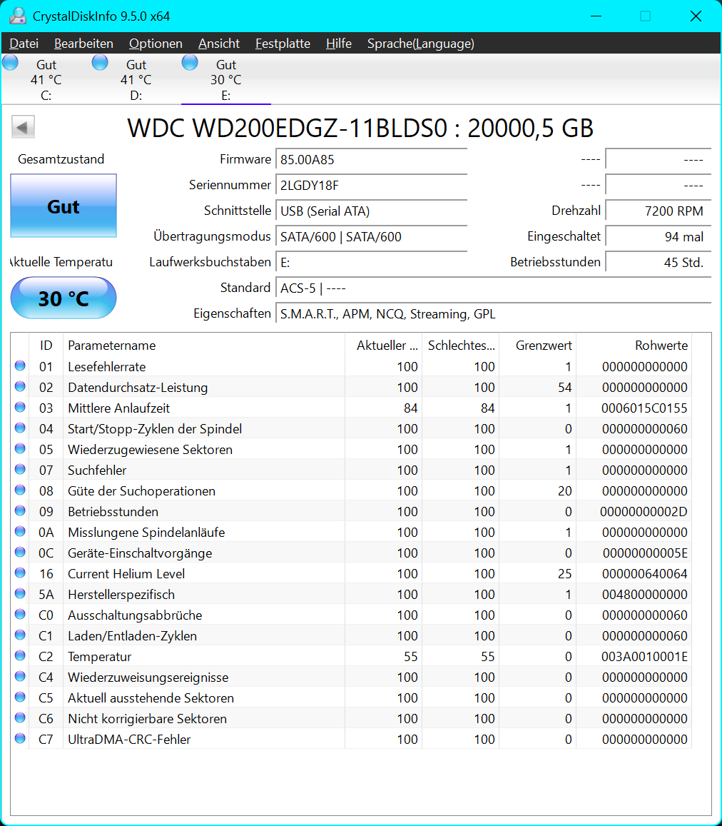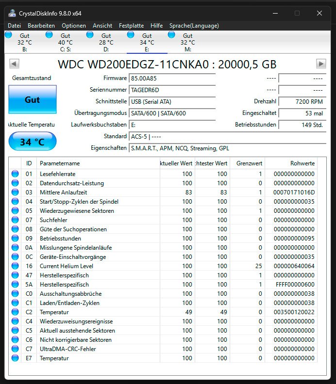 Ich habe Crystal DiskInfo mal darüber laufen lassen. Vor allem den Punkt Lesefehlerrate mit 100, während der Grenzwert bei 1 liegt, hört sich für mich schlimm an. Dann würde er ja 100-fach über dem Grenzwert liegen...
