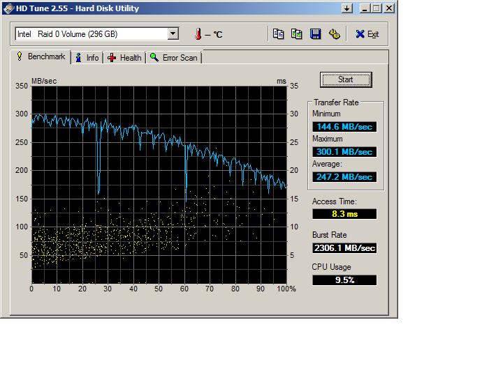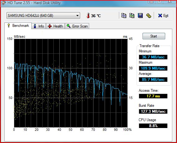 Ich habe mir vor ein paar Tagen eine Samsung Spinpoint F1 mit 640GB zugelegt. Natürlich habe ich erst auch einmal ein Benchmark gemacht um zu sehen was die neue Platte alles so drauf hat. Jedoch zeigt die HD-Tune Kurve beim Benchmark alle paar Sekunden einen erheblichen Transfer-Rate Einbruch. Die Platte ist am Intel-Controller der Boards angeschlossen.